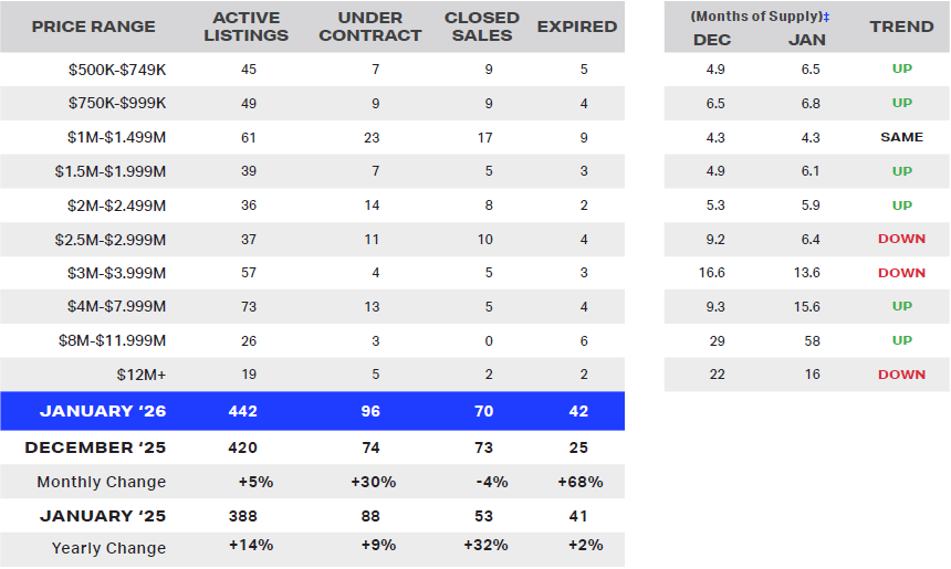 Overall, January reinforced a pattern we’ve been seeing: the guard-gated market is not moving in lockstep with the broader headlines. About half of the price ranges we track are sitting in balanced territory, homes between $1-1.5 million remain in a seller’s market, and above $3 million, buyers have more leverage as inventory builds and competition increases.