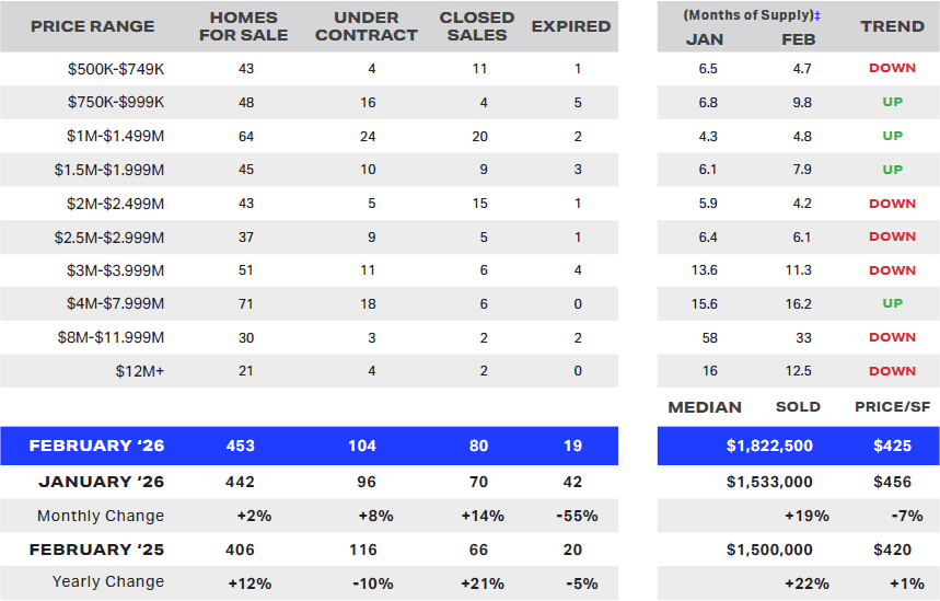 February’s data continues to show a market clearly segmented by price point, with the median guard-gated home price rising to just over $1.8 million.