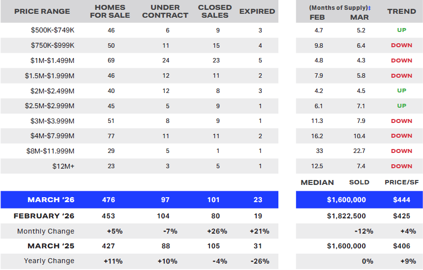 7 of the 10 price categories we track saw improvements, with months of supply trending downward. Most segments are now balanced or leaning toward sellers. The primary exception is the $4 million to $12 million range, where higher inventory levels are creating increased competition for sellers and greater negotiating power for buyers.