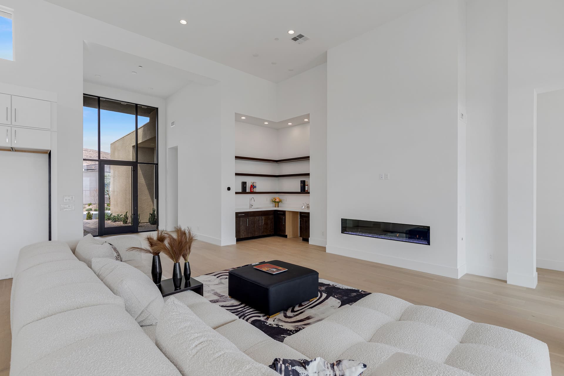 Endless entertainment awaits in the expansive great room, where 16’ ceilings and the generous use of glass create a bright and spacious atmosphere. Here, you can serve drinks at the wet bar, gather around the linear fireplace, and enjoy time with friends and family. The kitchen boasts a large island and high-end appliances, including a Wolf 48” Dual Fuel range with a hood. Dinner is served in the adjacent dining room. Open the 90º sliding door to create a sublime indoor/outdoor flow to the generous covered patio. A blank slate for your imagination, the backyard is currently unfinished.