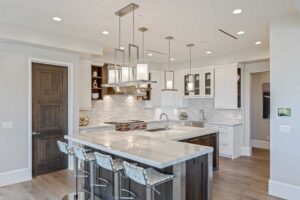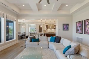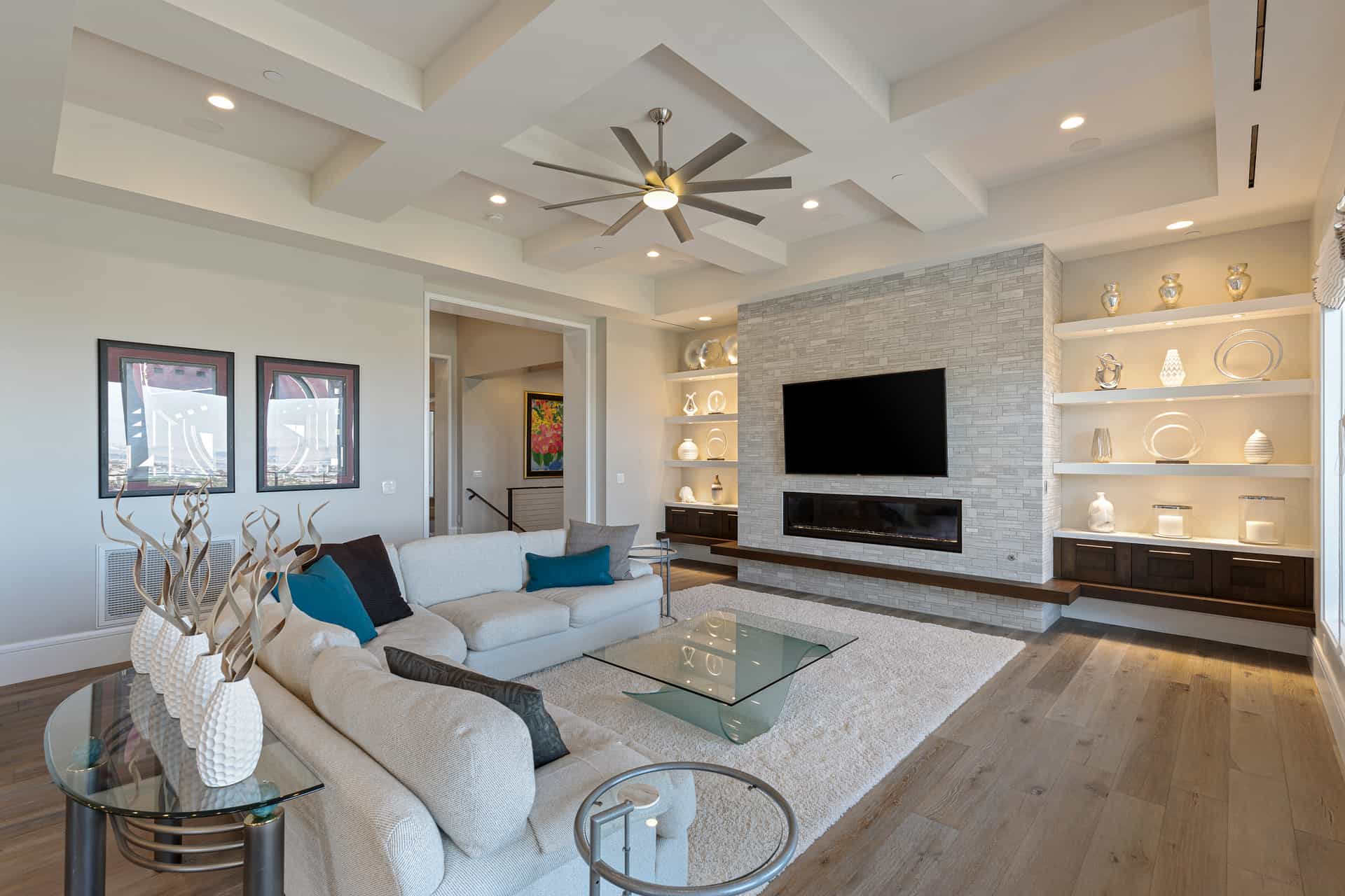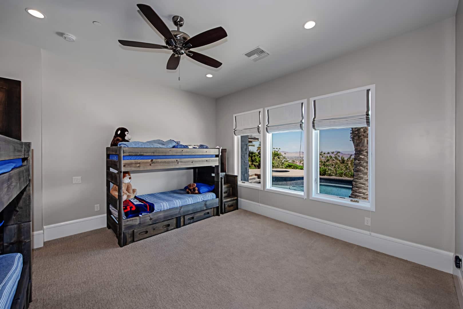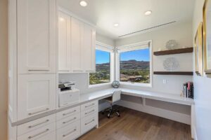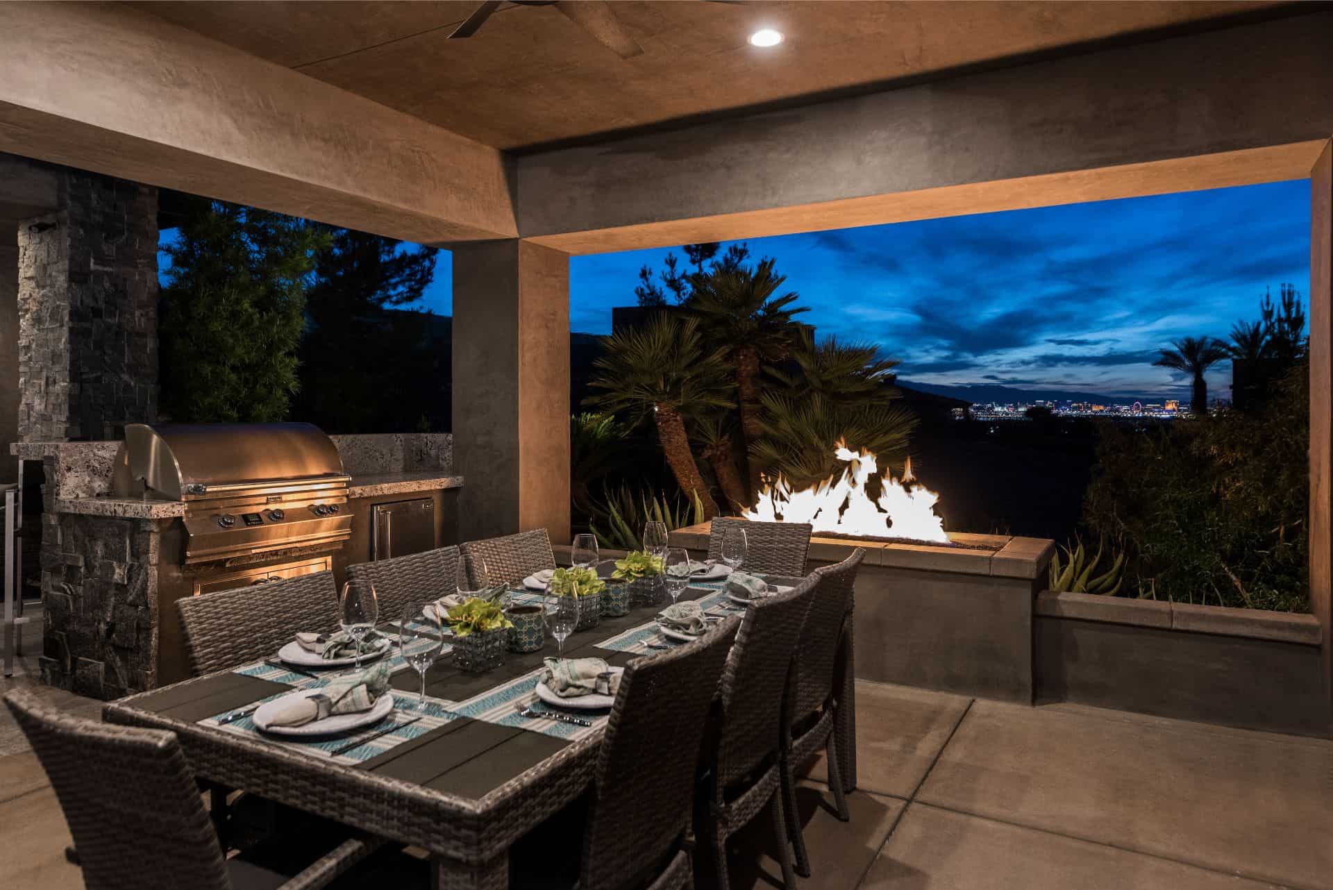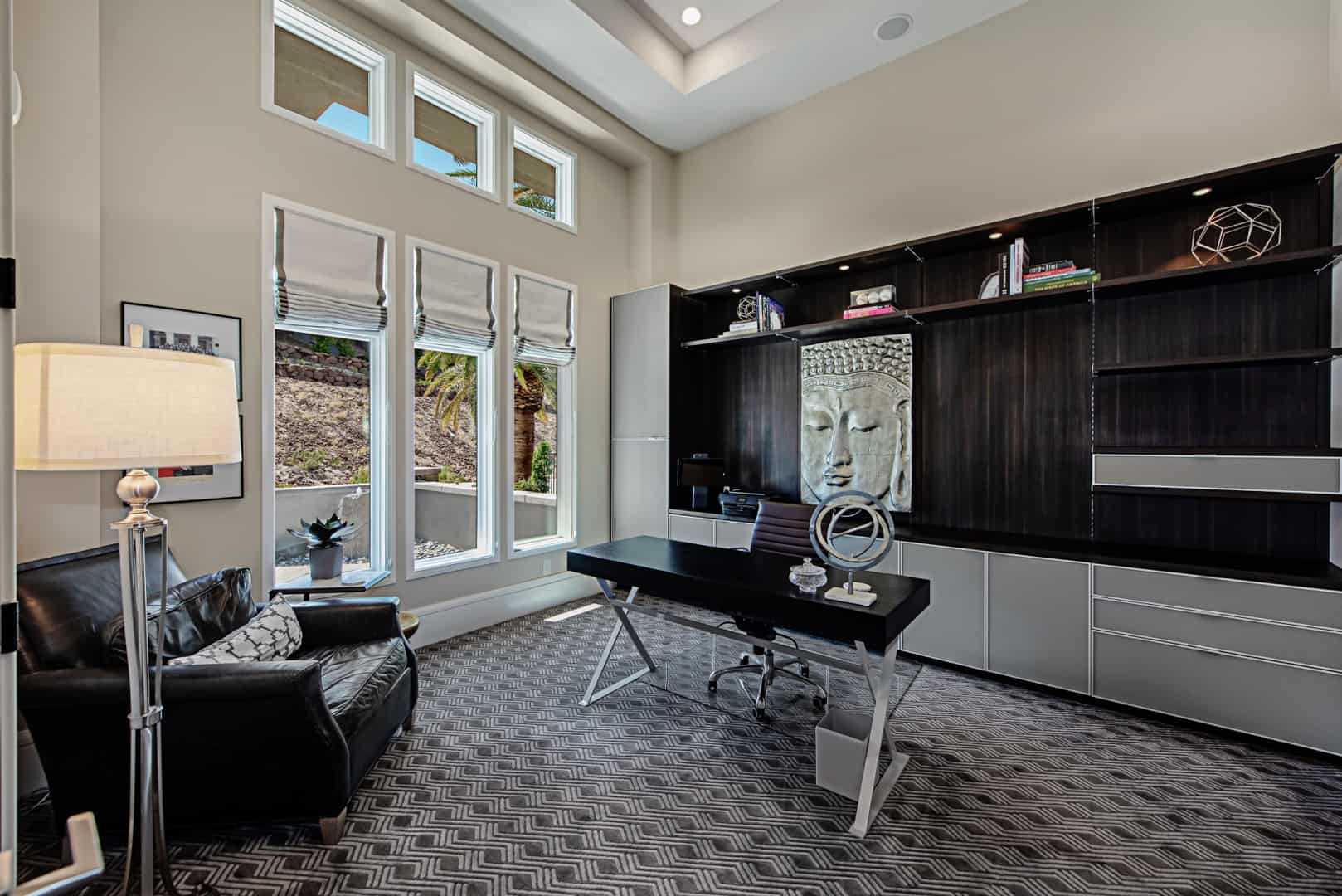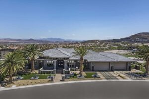 Enter the main level through the custom front door or garage. Situated above three of the four additional en suite bedrooms, the private, spa-like owner’s suite showcases a panoramic view of the Las Vegas Strip; amenities include room-darkening motorized shades, dual vanities and closets, a double shower with a bench, heated floors, and a Kohler smart toilet. Entertain friends and family in the open-plan great room and eat-in kitchen, where two-tone, soft-close cabinetry envelops a suite of Wolf and Sub-Zero appliances. Unquestionably convenient, the oversized pantry features a second refrigerator—and the butler’s pantry includes a warming drawer and Sub-Zero under-counter refrigerator. Share a formal meal in the dining room or step onto the expansive balcony for dinner with a view. When it’s time to work, the office with built-ins and motorized shades awaits.