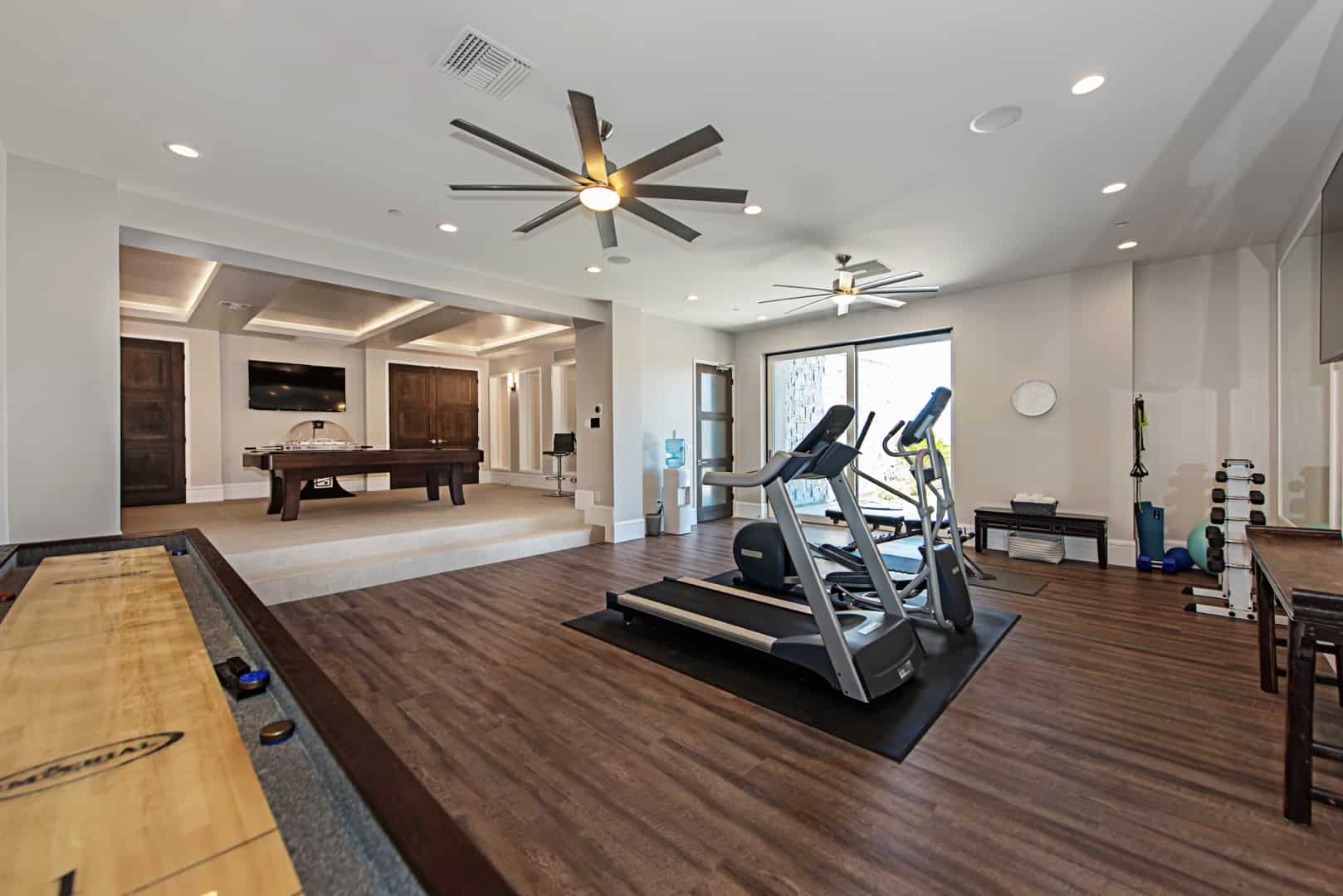 Enjoy endless entertainment on the lower level, where you can practice mixology at the wet bar, host a movie night in the theater, and exercise or play in the expansive gym/game room. Motorized pocket doors open to the private, elevated rear yard. Bordered only by fire and water features, palm trees, and an unobstructed mountain landscape, you can lounge in the resort-style pool and spa, barbecue in the shaded outdoor kitchen, or refine your skills on the putting green. Full control of your televisions, whole-home sound, Nest thermostats, eight-camera security system, and pool is at your fingertips with Control4 smart home automation. Additionally, every window is pre-wired for motorized shades, and an elevator and outdoor stair lift have been added for accessibility.