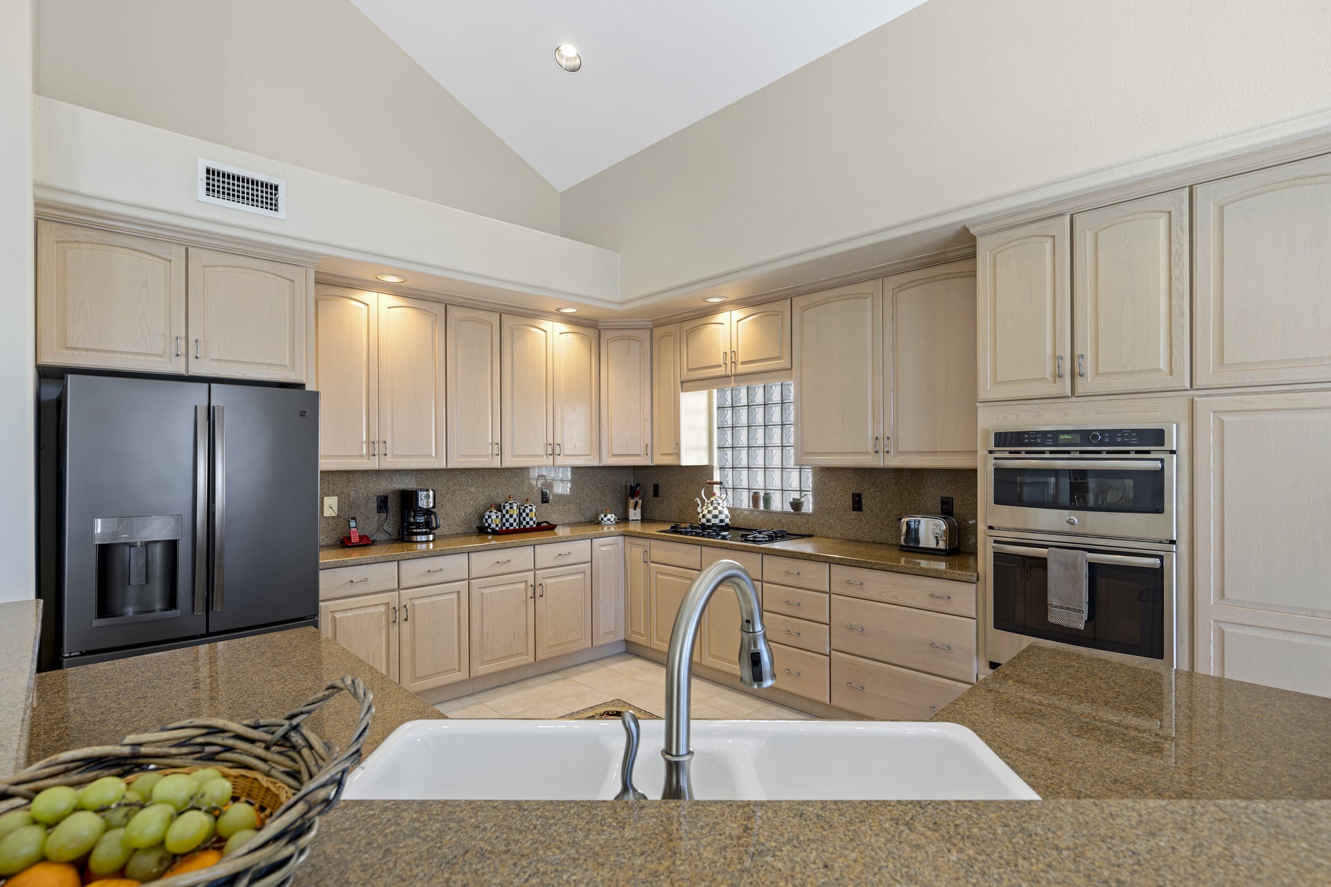 Beyond the formal living and dining room, savor life in the kitchen, which features GE appliances, granite countertops, and an expansive island with a raised bar top. Open the sliding glass door to enjoy the covered patio—or gather in the adjacent family room, complete with a wet bar, gas fireplace, and built-in entertainment center.