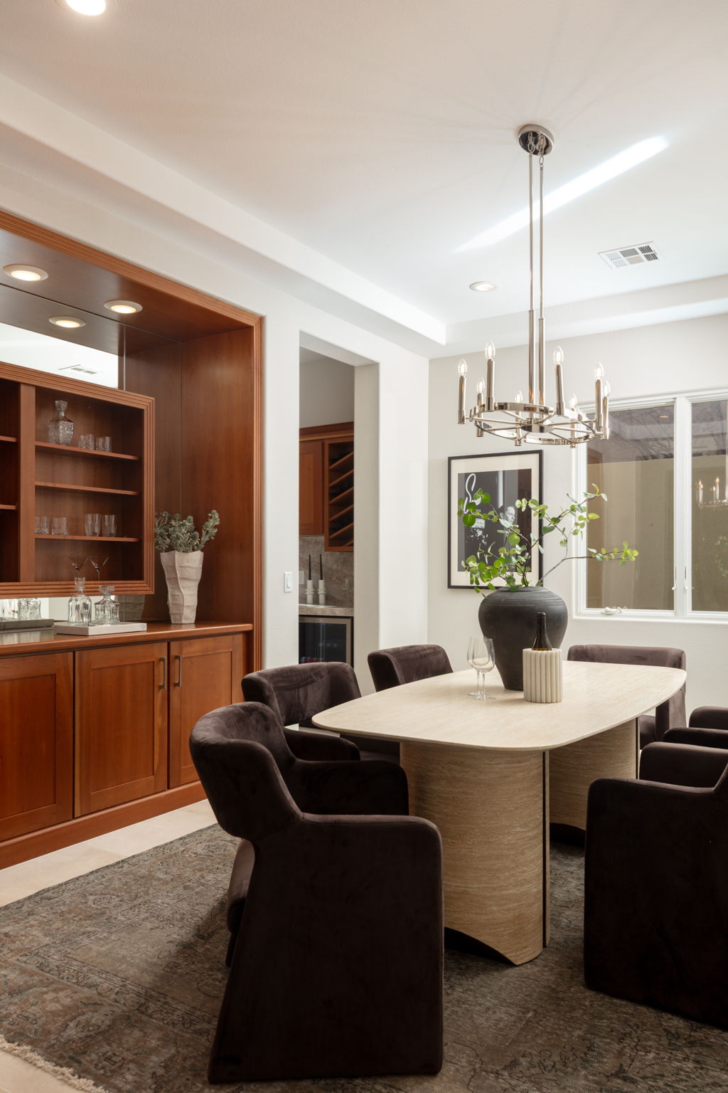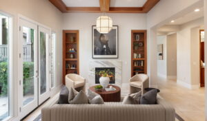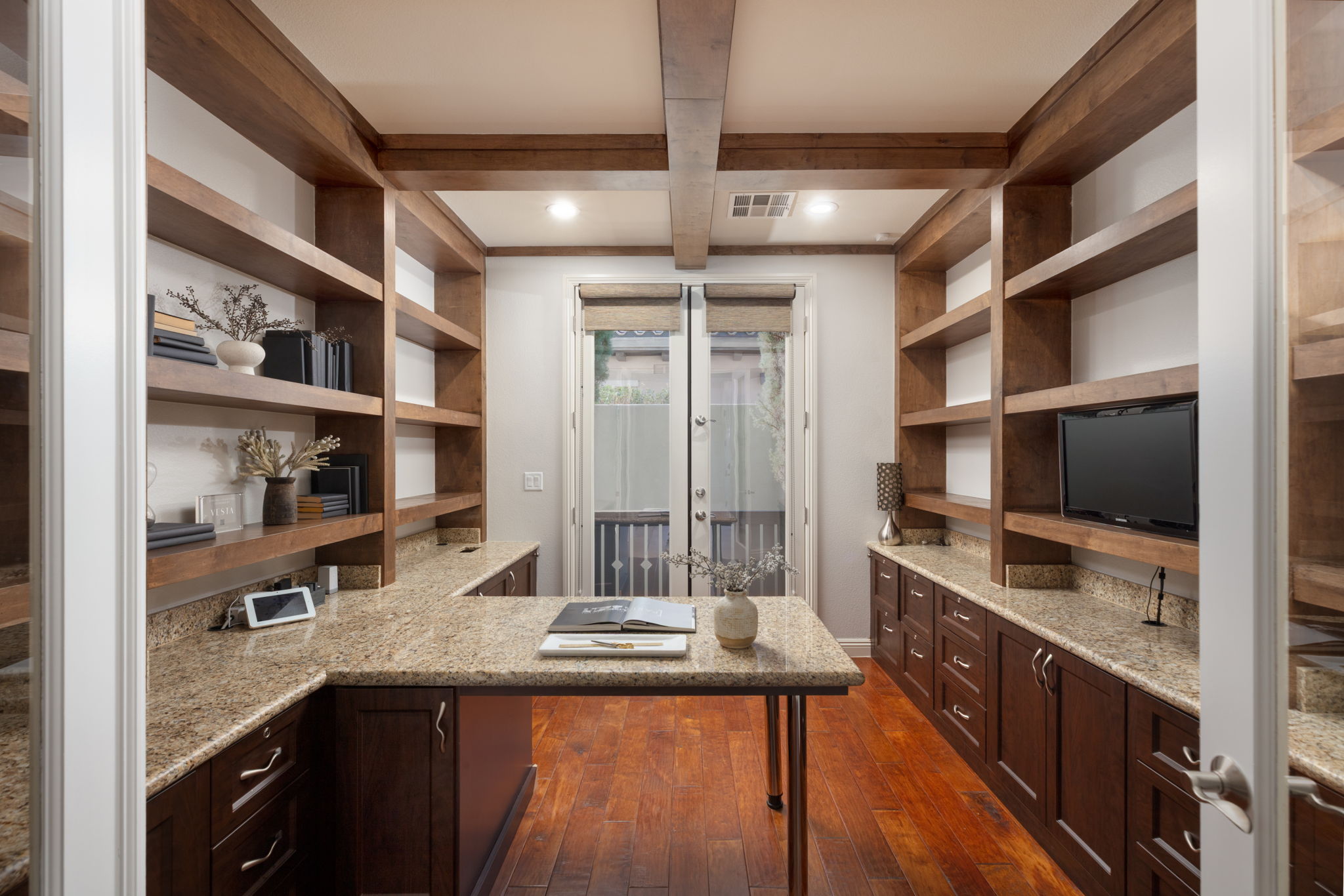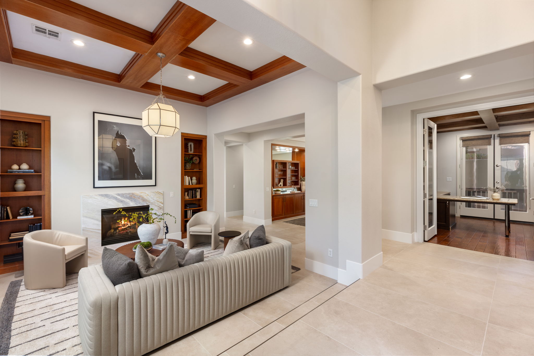 Greet your guests in the open and inviting living room, which connects to a peaceful courtyard through French doors. An enormous quartz waterfall-edge island defines the kitchen, complete with a suite of Viking Professional appliances and a new dishwasher. Beyond the butler’s pantry with built-in wine storage, dinner is served in the dining room. Enjoy a movie in the family room—which is wired for surround sound and features a new linear fireplace—or gather in the den for a game night. Anyone working remotely will appreciate the home office with full built-ins.