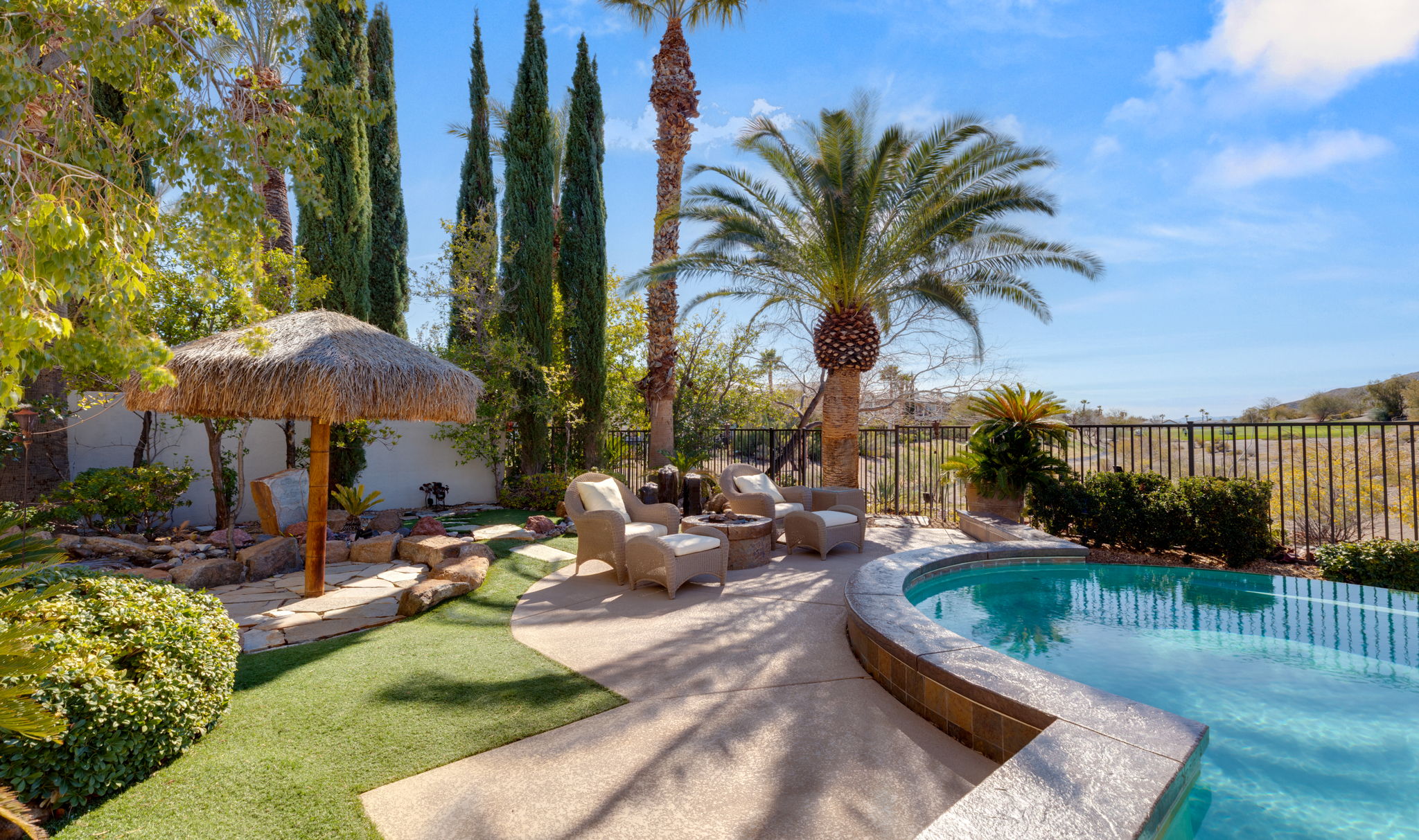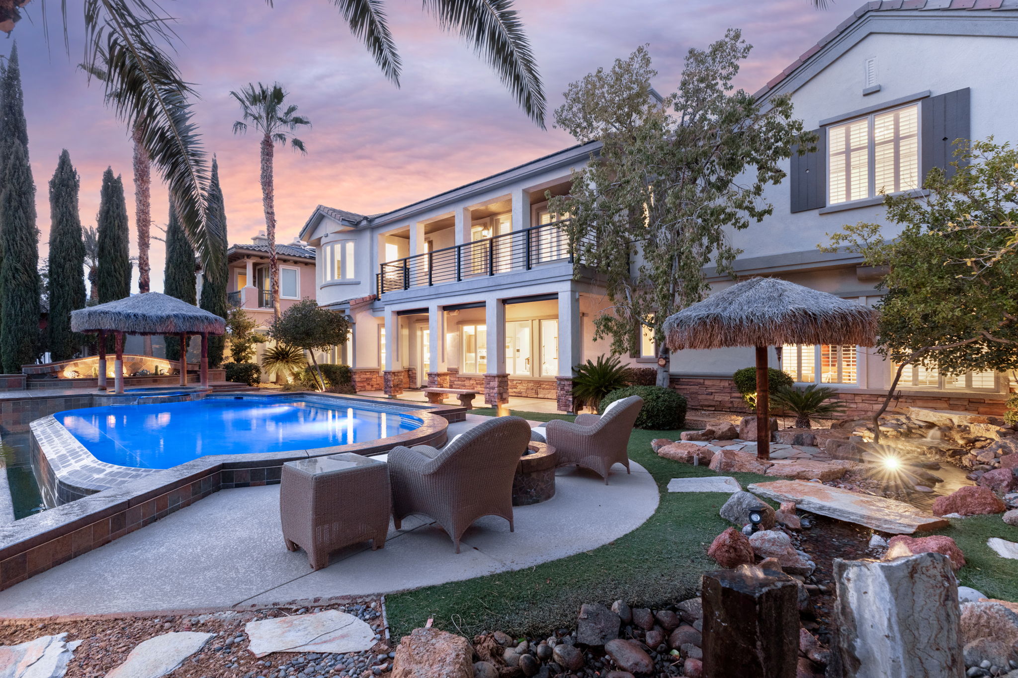 This recently renovated Toll Brothers two-story presents one of the best views in the 24-hour guard-gated community of Red Rock Country Club. Situated on a lot overlooking the second hole of the Arroyo golf course (safely out of golf ball range behind the tee), this property boasts a stunning backyard with an infinity-edge pool, a spa shaded by a palapa, a tranquil water feature, a fire pit, and a covered patio with sun shades—all backdropped by lush fairways and nearby mountains. Upgraded at the cost of over $370,000, the incredible interior has been refreshed with new flooring, paint, baseboards, light fixtures, countertops, and more.
