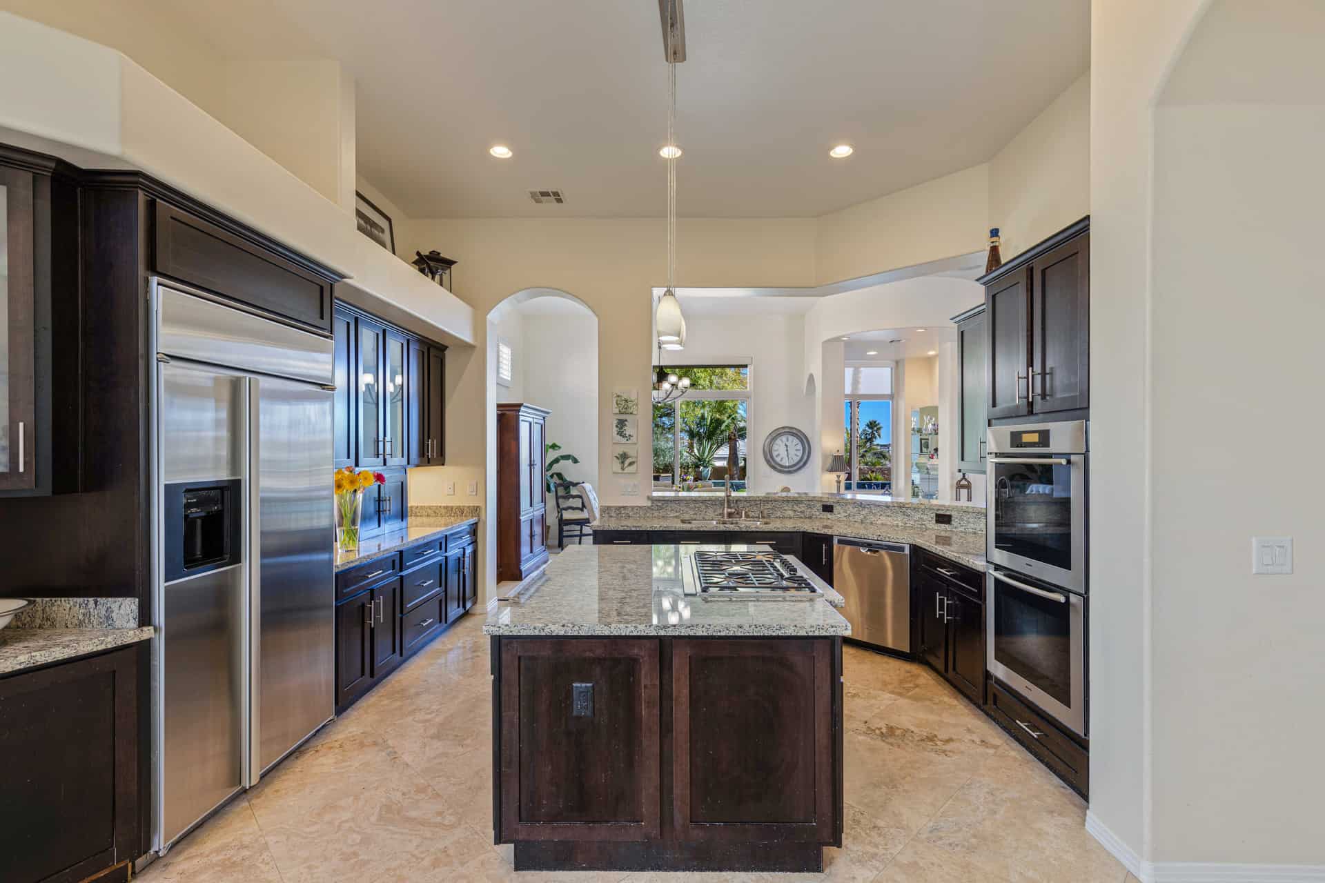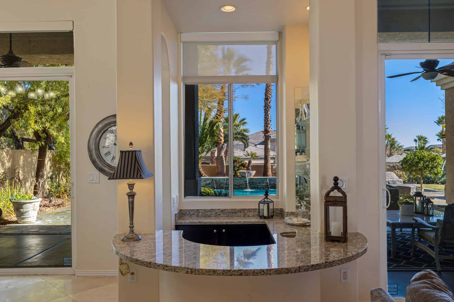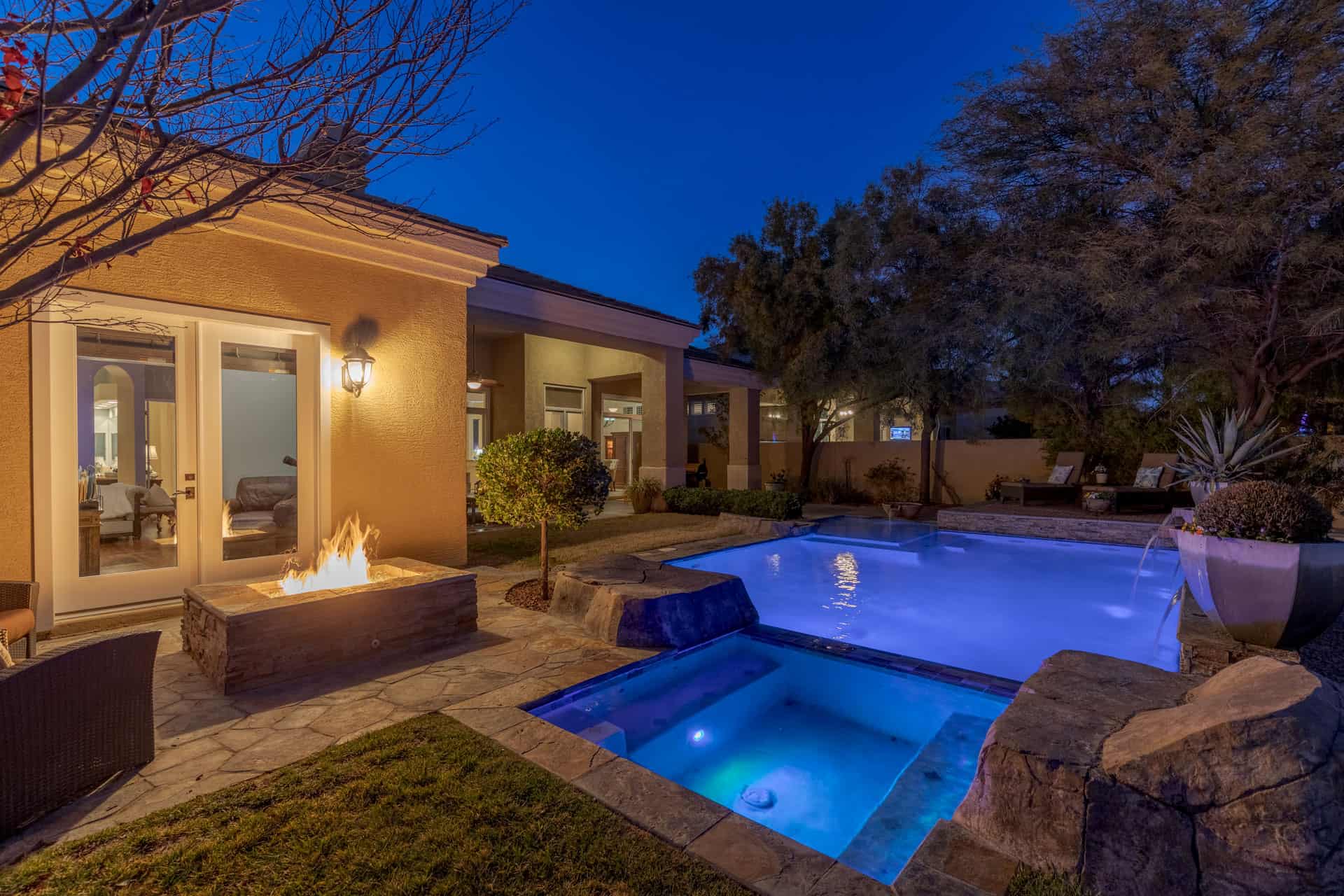 The heart of the home is the kitchen, complete with a curated collection of high-end appliances: a GE Monogram refrigerator/freezer, a Bosch five-burner stove, Miele double ovens, and more. Whether you’re feasting in the dining area, enjoying a surround-sound movie in the living room, or lounging on the covered patio, refreshment is always nearby at the sunken, indoor/outdoor wet bar. Endless entertainment awaits in the backyard, where you can gather around the fire pit, catch some rays on the raised sunbathing deck, or simply enjoy the pool and spa.