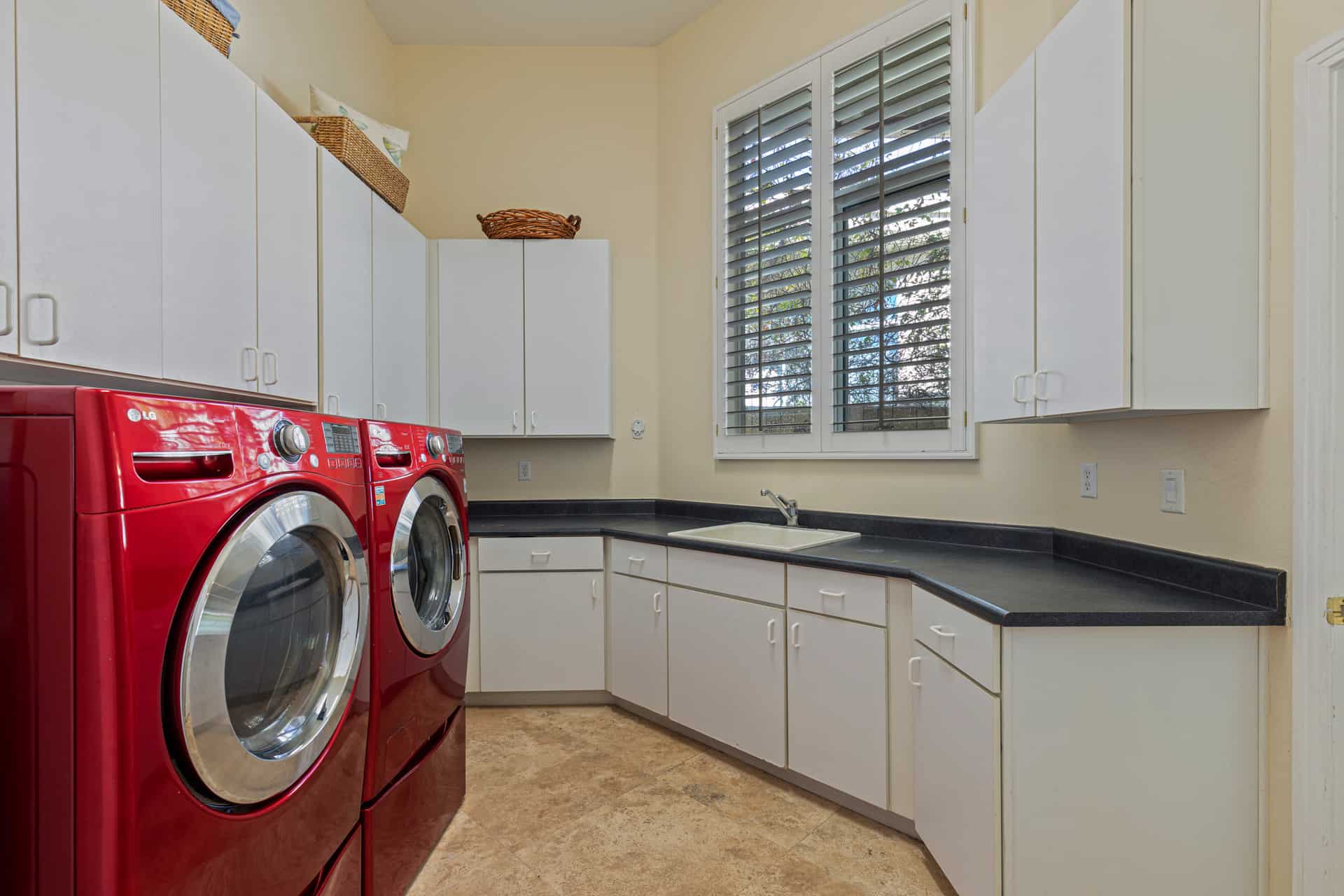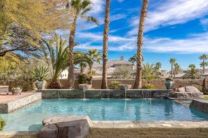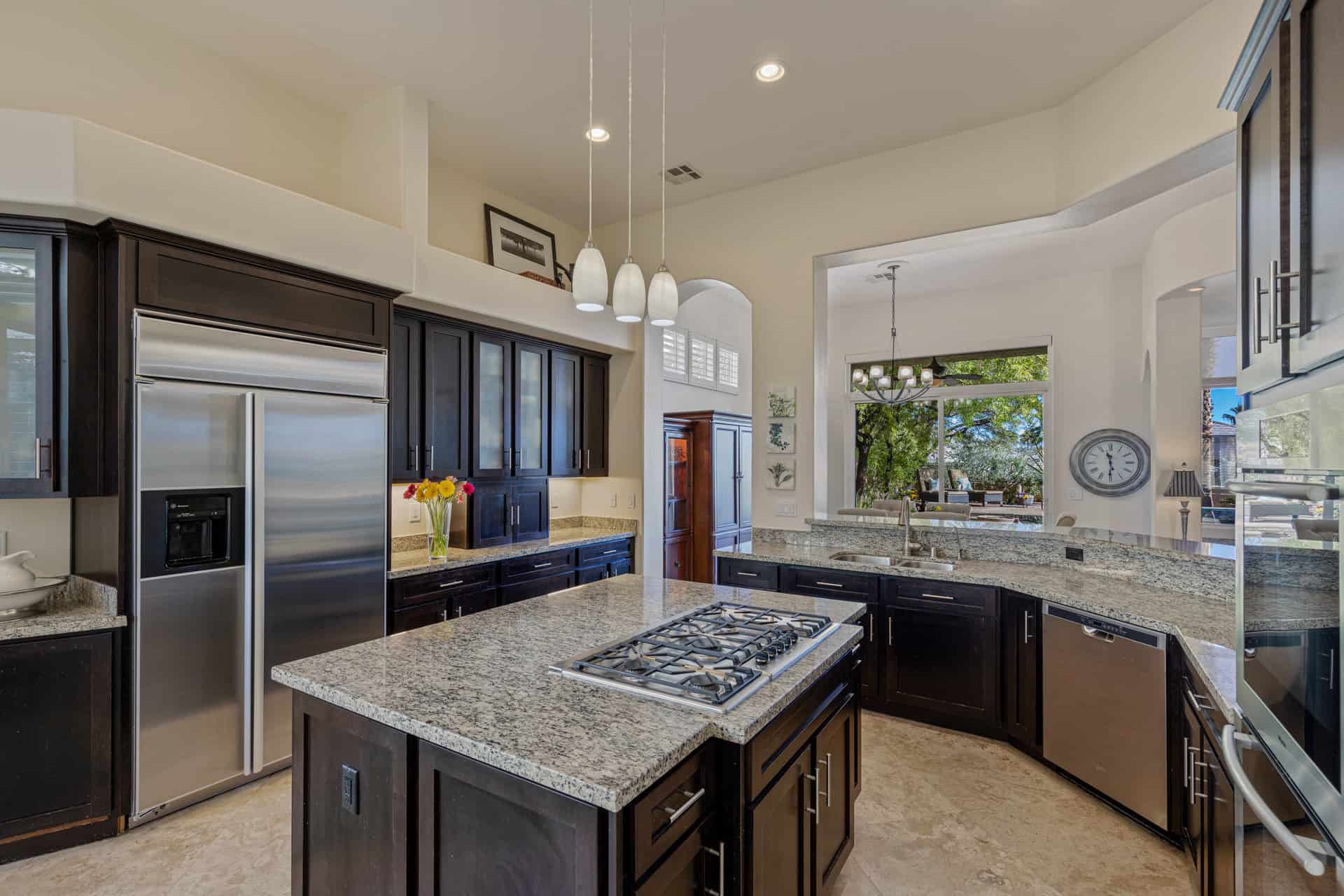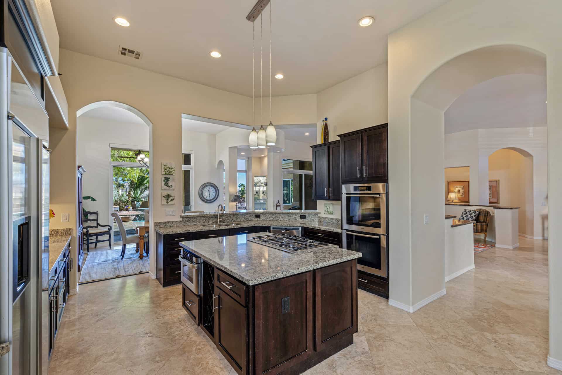 The heart of the home is the kitchen, complete with a curated collection of high-end appliances: a GE Monogram refrigerator/freezer, a Bosch five-burner stove, Miele double ovens, and more. Whether you’re feasting in the dining area, enjoying a surround-sound movie in the living room, or lounging on the covered patio, refreshment is always nearby at the sunken, indoor/outdoor wet bar. Endless entertainment awaits in the backyard, where you can gather around the fire pit, catch some rays on the raised sunbathing deck, or simply enjoy the pool and spa.