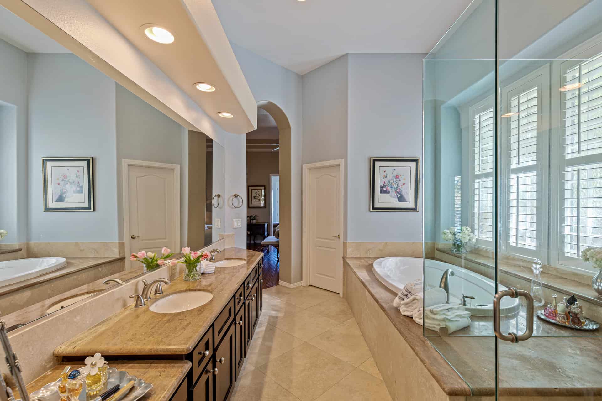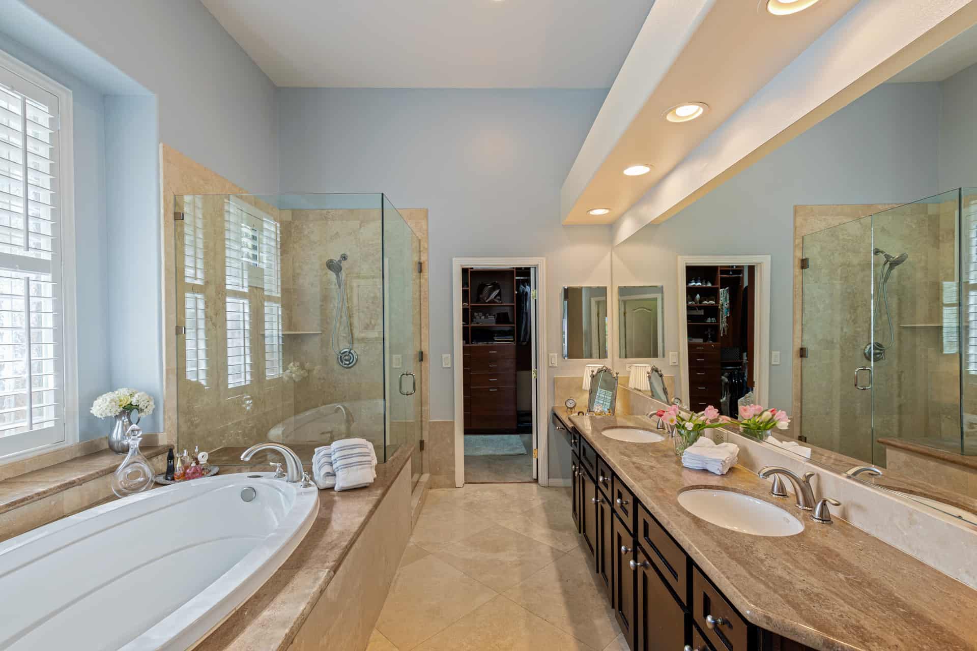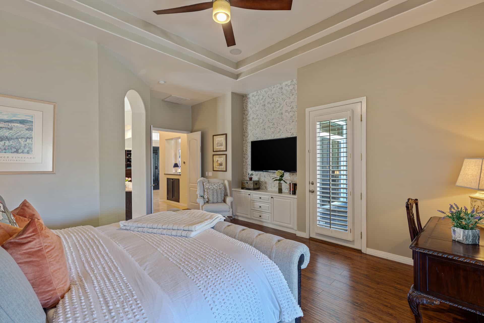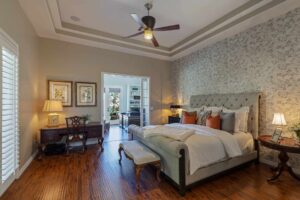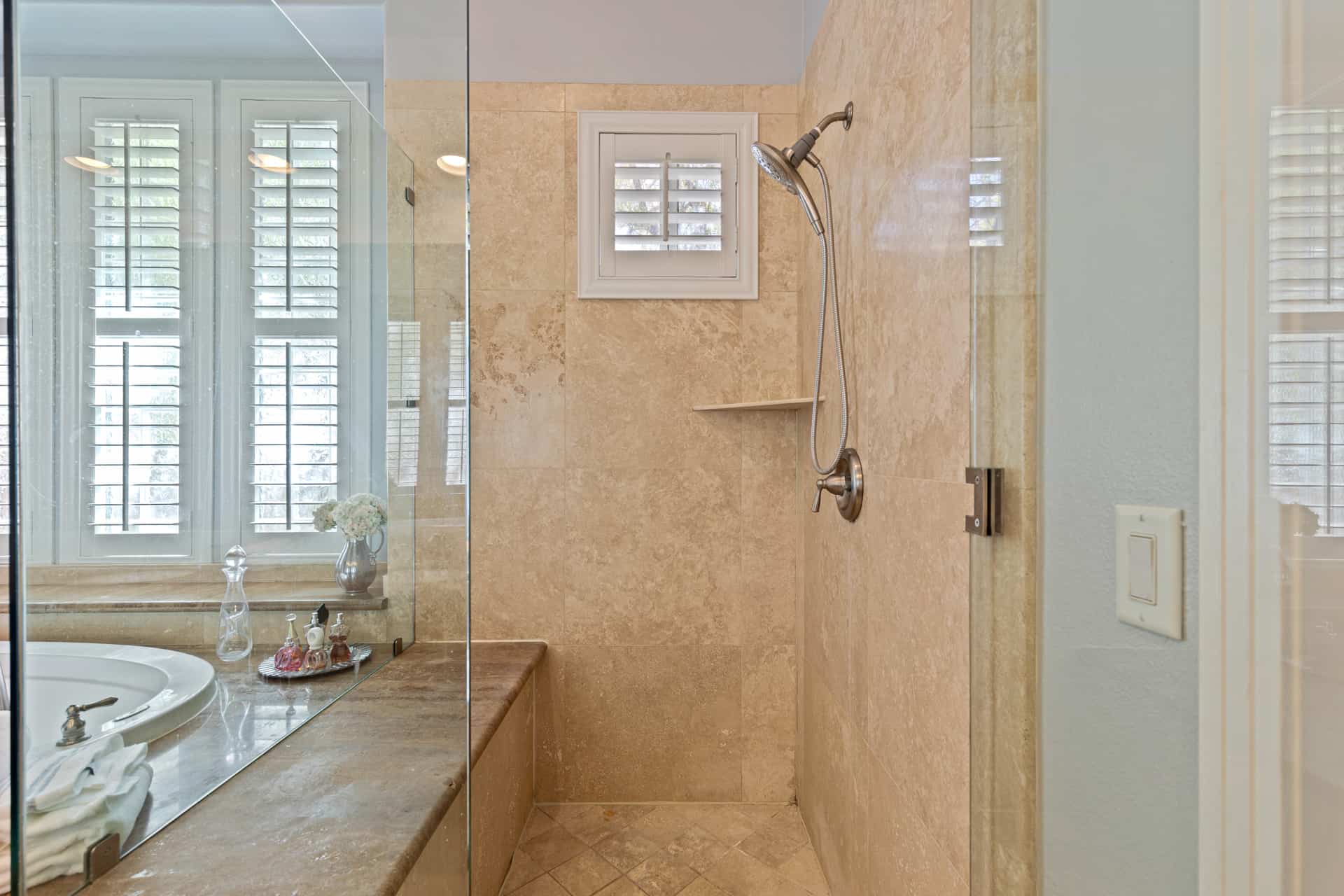 Your personal oasis awaits in the owner’s suite, which opens to the patio for ultimate convenience. The attached den would make an ideal sitting room, home office, gym, or nursery. The primary bathroom includes everything you need to feel comfortable: an oversized shower with a bench, a large bathtub, a walk-in closet with built-ins, and a double vanity with a beauty counter.