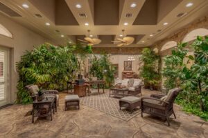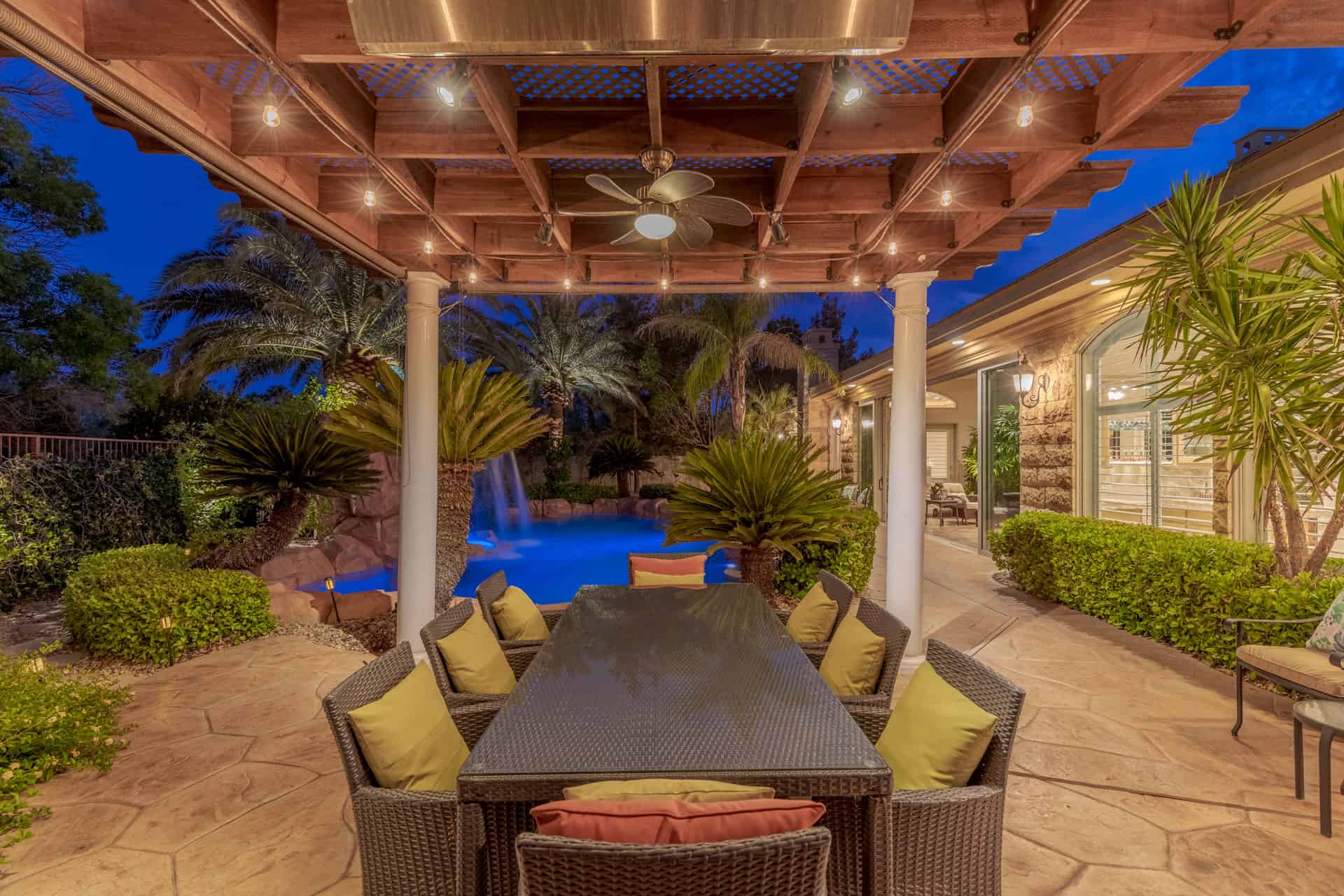Boasting the same granite as the Bellagio, the chef’s kitchen is as beautiful as it is functional, but true resort-style living awaits in the skylit lanai. Designed to bring the outside in, this air-conditioned veranda features an irrigated garden bed and a 25’ wide wall of glass that opens to the pool deck. Surrounded by lush and well-lit landscaping, lounge beneath the pergola, indulge in the grotto spa, or swim in the 50’ lagoon pool—complete with a swim jet and roaring waterfall feature. Endless relaxation awaits in the owner’s suite, which features direct access to the lanai, a custom fireplace, and a spa-like bathroom finished in floor-to-ceiling marble. Anyone working from home will appreciate this home’s private den with wood built-ins and a spiral staircase to the loft above. Four additional en suite bedrooms complete the living quarters, all with walk-in closets. Other highlights include dual two-car garages, a Honeywell alarm system with cellular monitoring, and built-in speakers in most common areas.