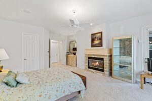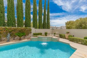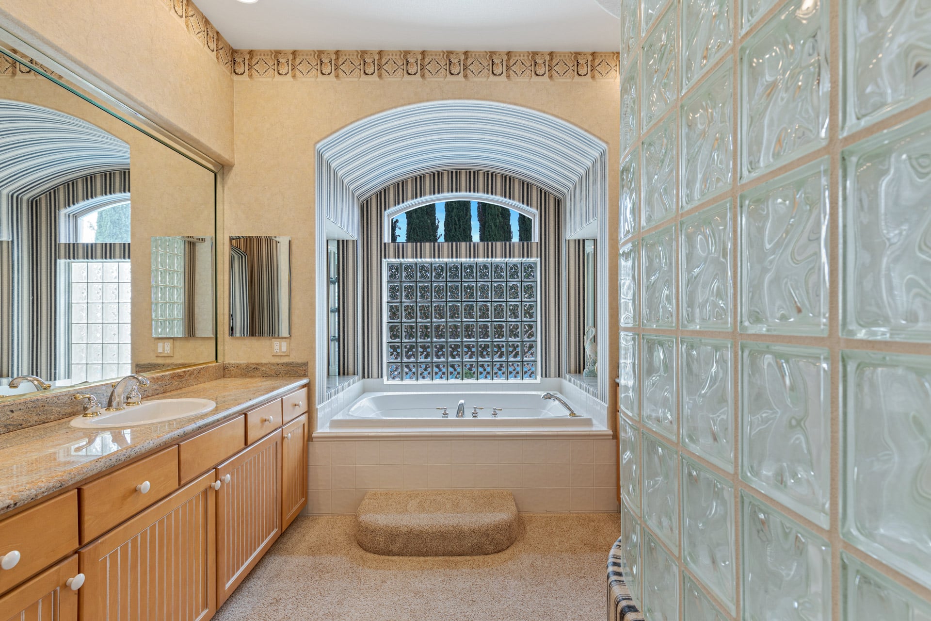 Ultimate relaxation awaits in the primary bedroom, which has direct access to the pool deck. Amenities include a gas fireplace, a large jetted tub, a walk-in shower with a bench, and dual vanities with a beauty counter. Completing this home are two additional bedrooms that share a Jack and Jill bathroom—plus a spacious home office with built-ins. Additional highlights of this property include air conditioning in the second garage and an alarm system with glass-break sensors.