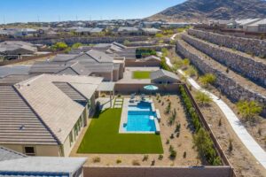 An upgrade worthy of envy, 14’ wide corner sliders connect the great room to the covered terrace, a sizable lounge space complete with a fireplace, ceiling fan, and pergola. Relax in the shade or join your guests in the turf-skirted pool for a little sunbathing on the sun shelf. The yard is also plumbed for a spa if you wish to add one. As the sun sets behind the mountains, dine al fresco and know that this is the good life. When privacy calls, retreat to the lavish owner’s suite, complete with a sitting room, dual vanities with a makeup counter, an enormous walk-in closet, an oversized freestanding bathtub, and a 12’ wide dual-entry shower. An office by the front door, a spacious den, and two additional bedrooms with walk-in closets complete this home.