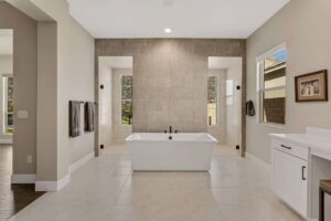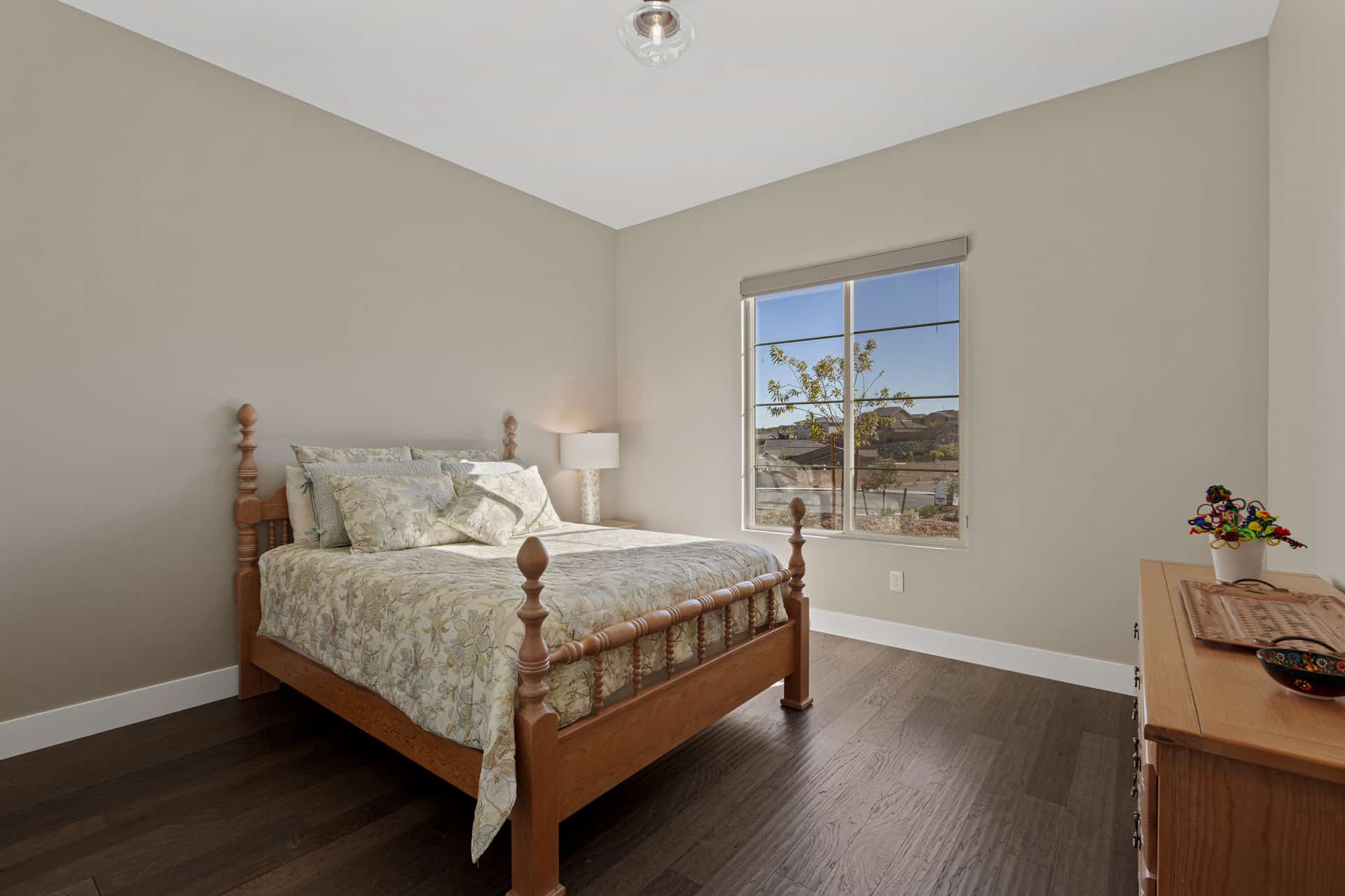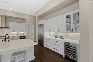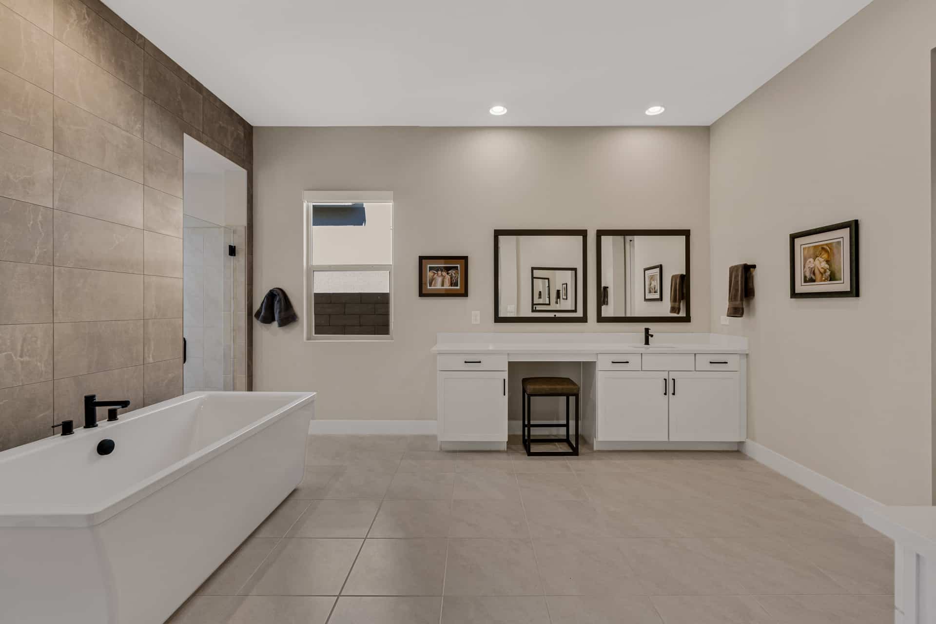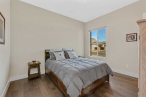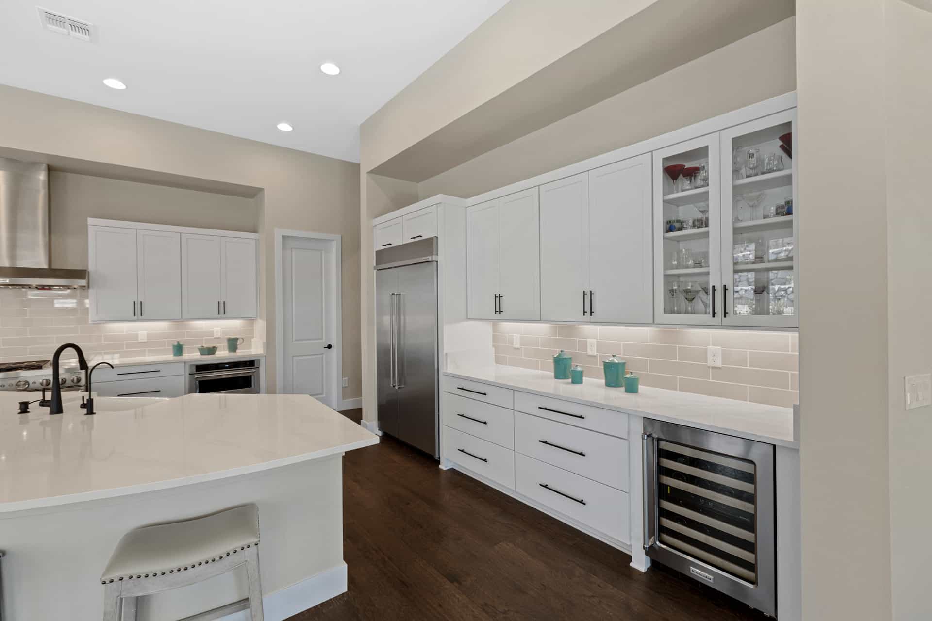 A rare sense of peace awaits at this brand new single-story estate in Reverence, an esteemed guard gated Summerlin community developed exclusively by Pulte Homes. Built on a .29-acre lot in The Point—a Reverence neighborhood composed of all single-story, ranch-style homes—this property enjoys breathtaking views of the nearby mountains. The modern design features quartz countertops, engineered hardwood floors, and customized cabinetry. Enter directly into the heart of the home, an expansive great room with 12’ ceilings and picture windows that capture stunning sunsets over the mountains. Here, you can gather around the dining table to share a meal, watch a surround sound movie, or sit at the generous kitchen island to keep whoever’s cooking company. The kitchen features soft-close drawers, a farmhouse sink, and a suite of high-end KitchenAid appliances—including a built-in wine cooler and a commercial-style dual fuel range, which you can control remotely using an app.