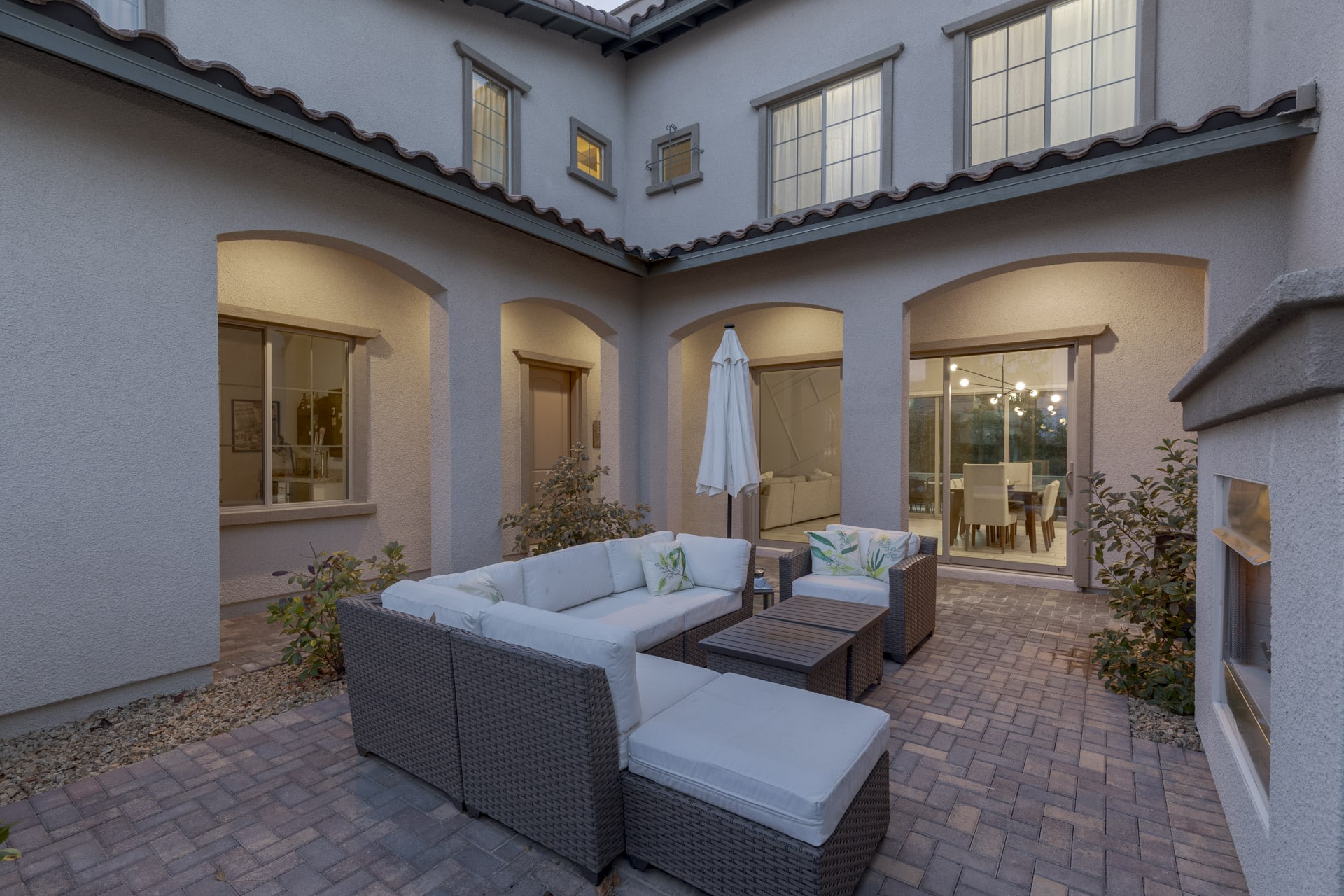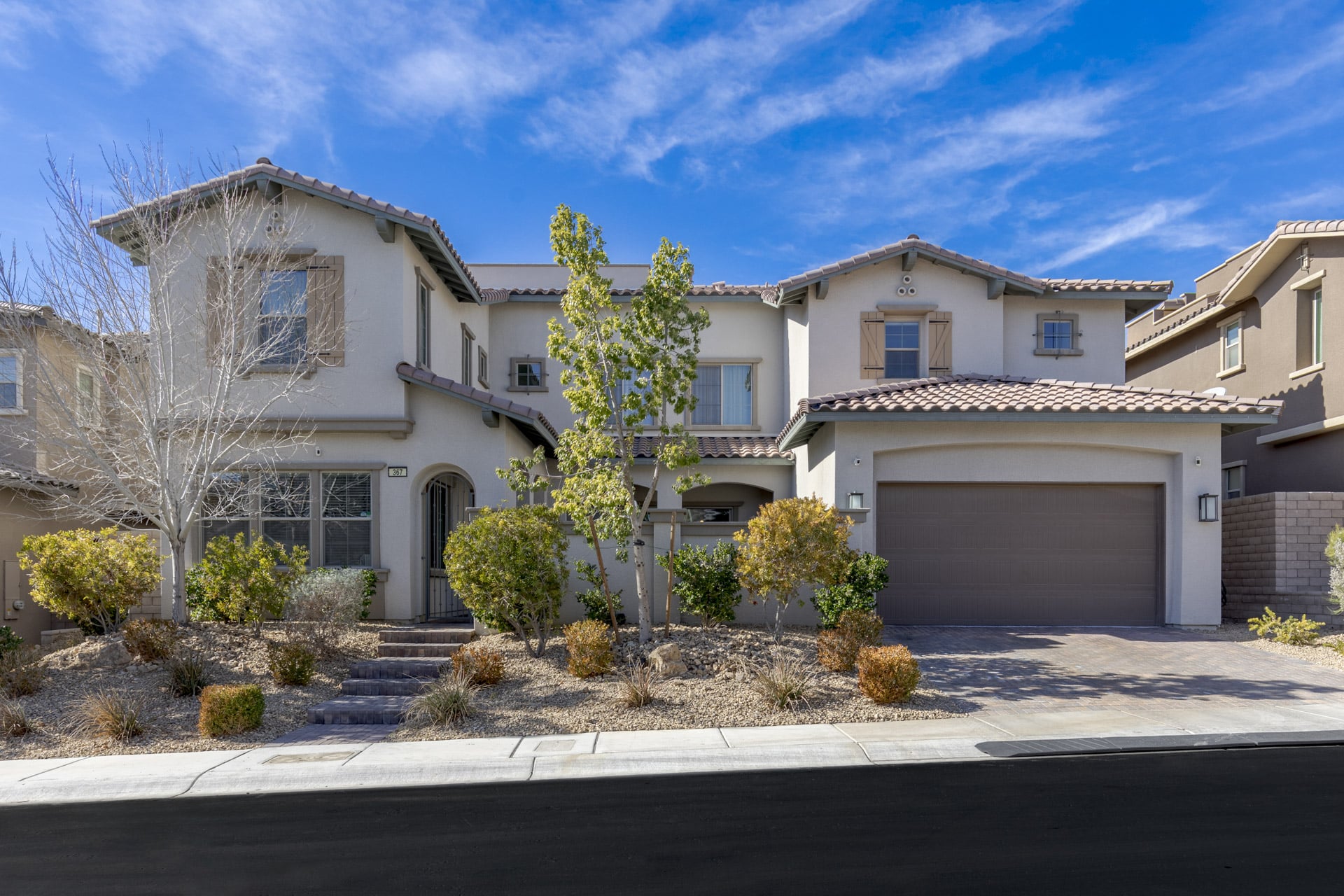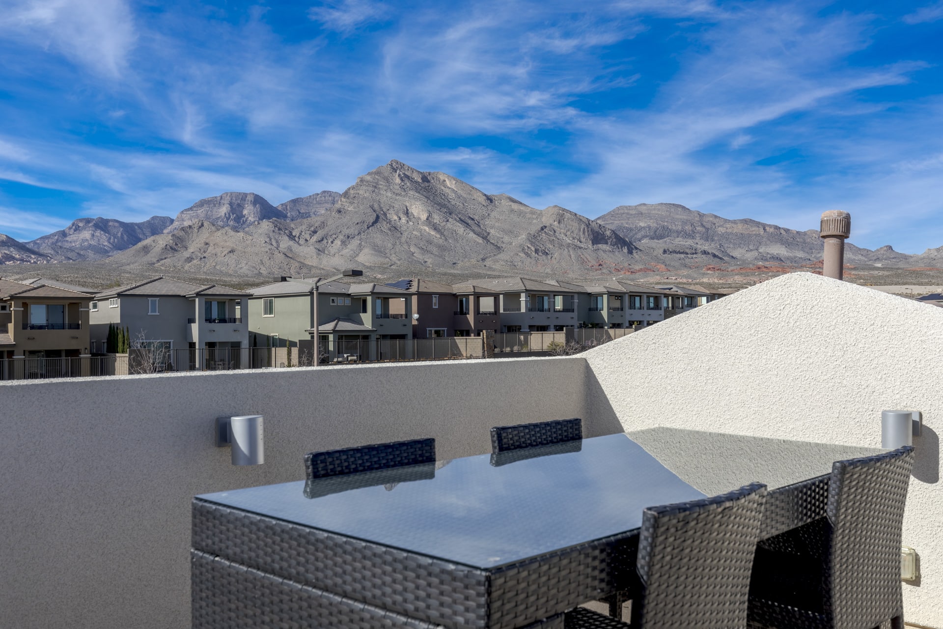 Discover unobstructed 360º views of the Las Vegas Strip and Red Rock Canyon from the rooftop deck of this gorgeous two-story home. Located in a gated community within Summerlin’s Paseos village, this property is perfect for anyone that loves to relax in the beauty of their own home. As you enter, you are welcomed by custom wall accents and an open floor plan. On the main level, expand the living space by opening two oversized stacking sliders to create a seamless flow from the courtyard to the pool.