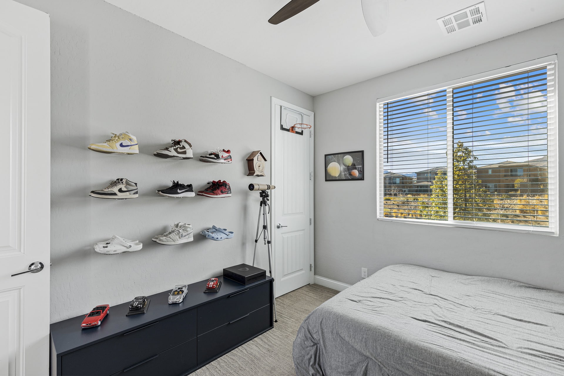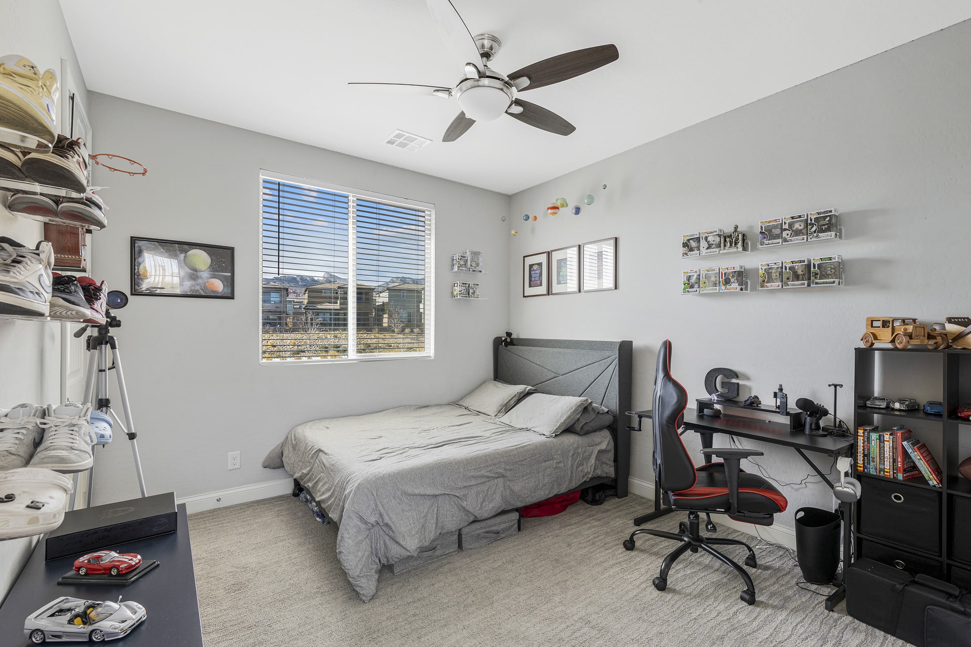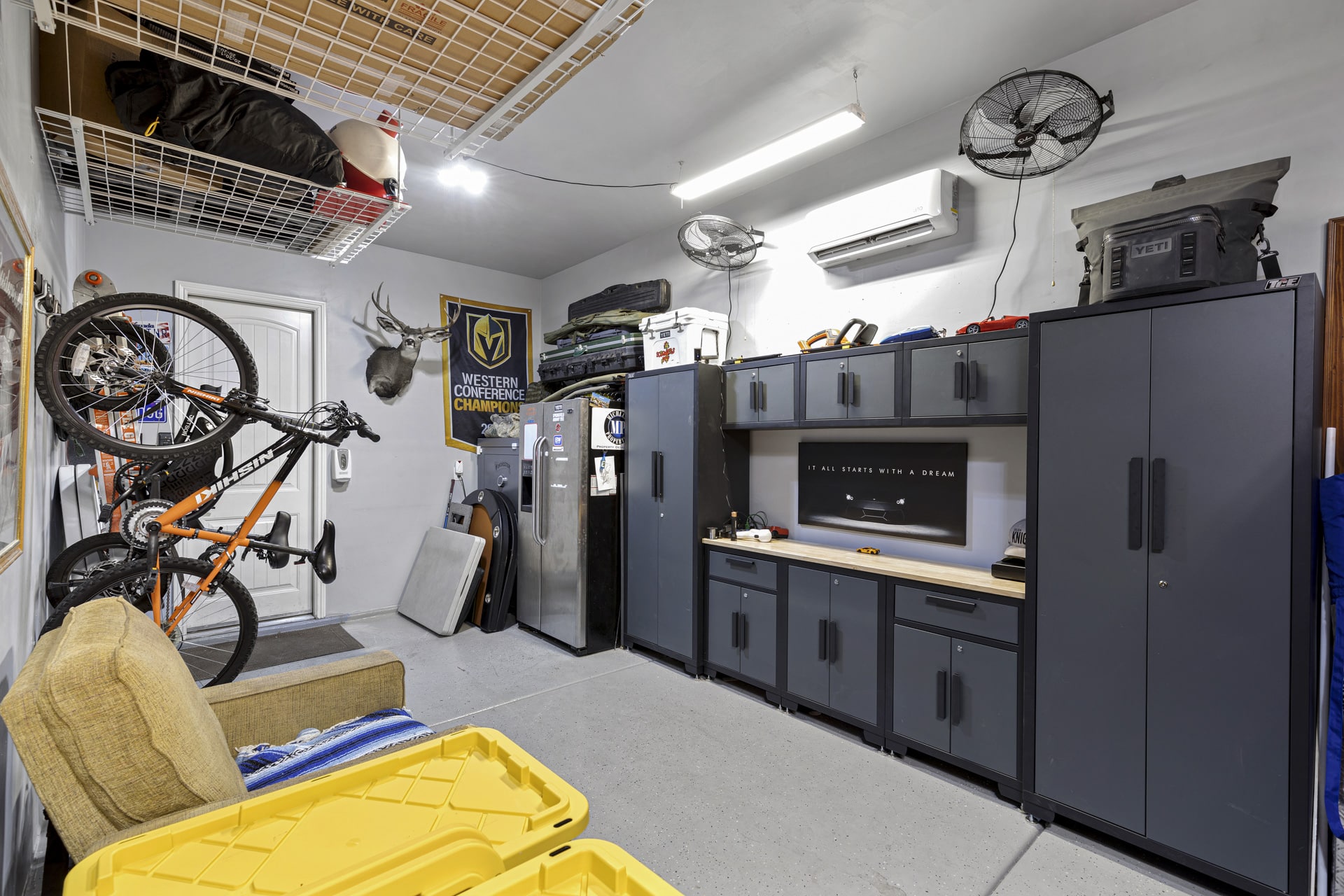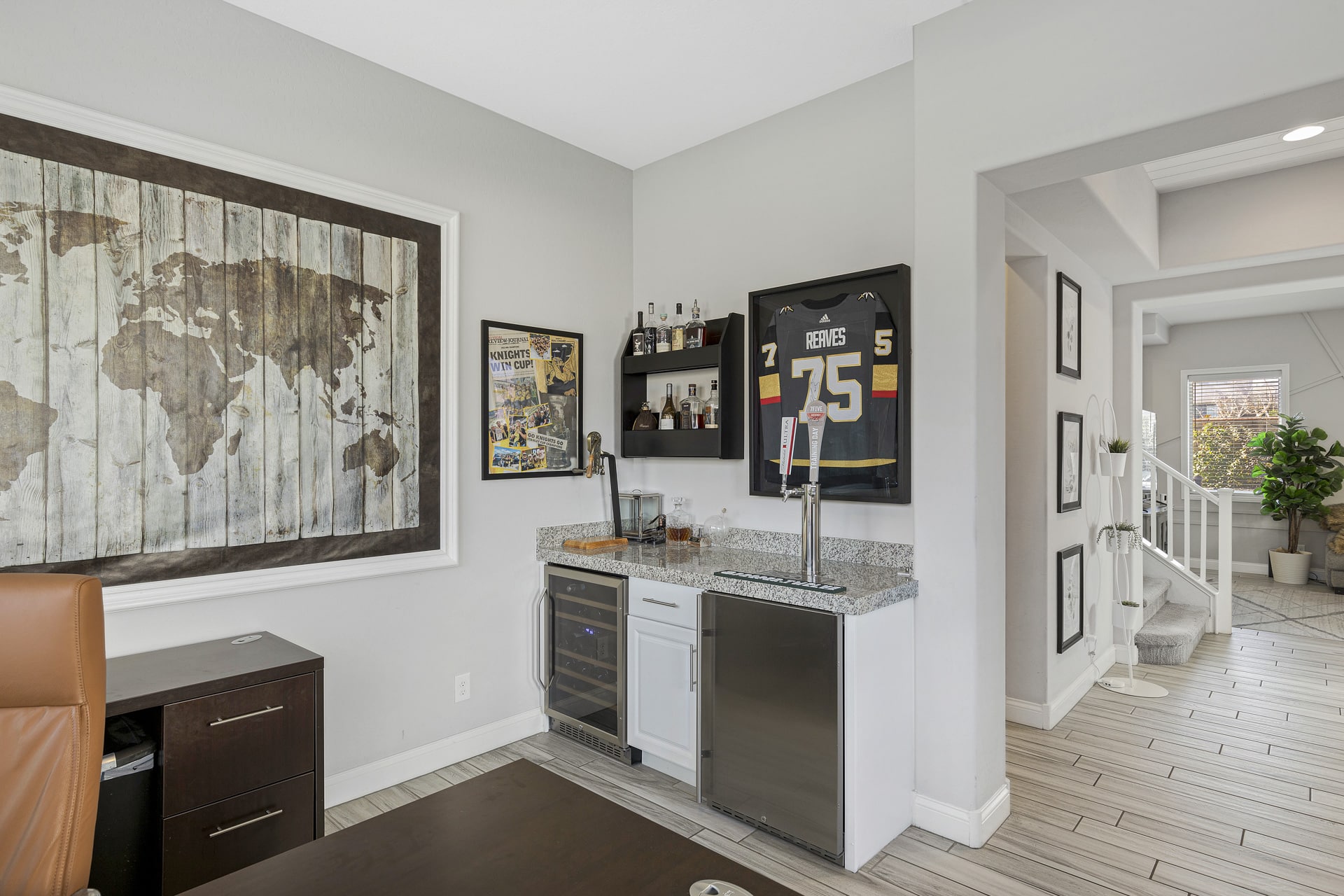Just off the formal living room, find an office featuring a built-in bar with a wine fridge and draft beer tap system. As you make your way upstairs, rest and relaxation await you in the owner’s suite, which boasts a large built-in closet with soft-close drawers, an oversized walk-in shower, and a double vanity. This remarkable Summerlin home is completed by two additional bedrooms with custom built-in closets, an upstairs loft area, plenty of storage closets, and a climate-controlled, tandem garage with space for three cars.