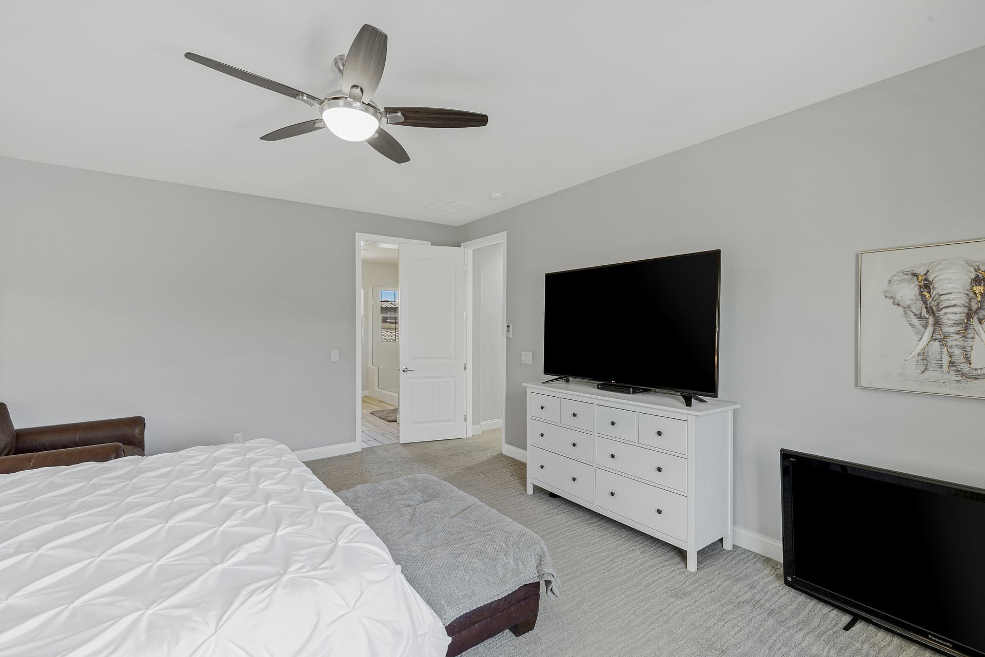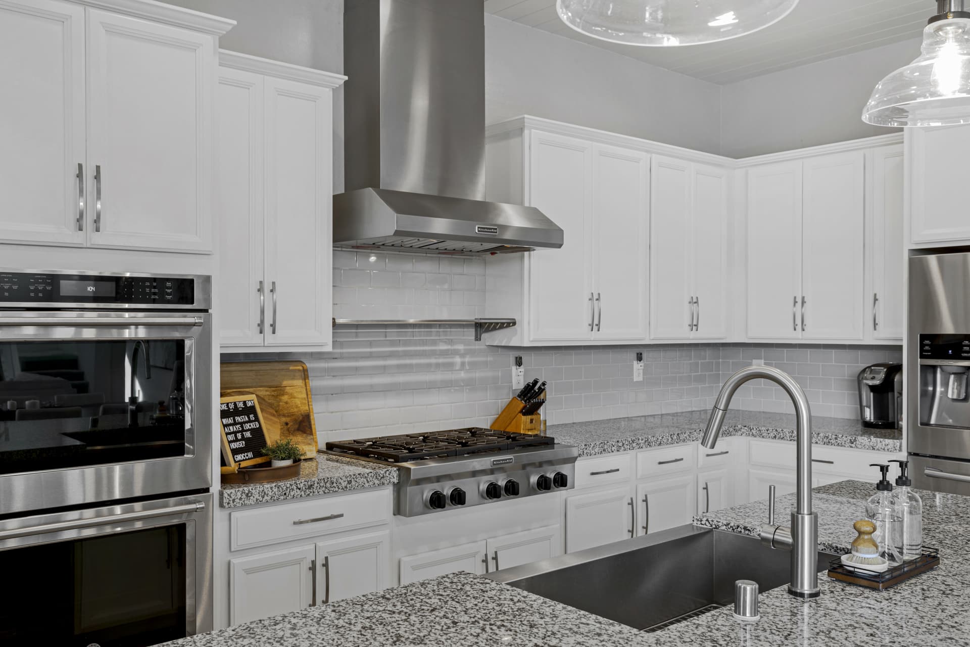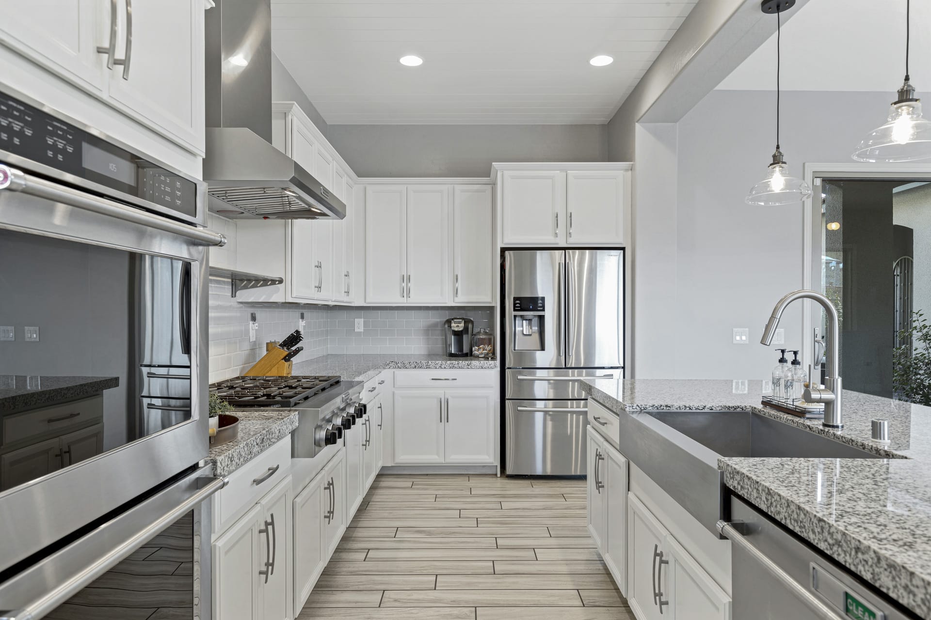 A large granite island defines the kitchen, where you can enjoy a suite of KitchenAid appliances and a Samsung refrigerator/freezer. Double ovens, a custom walk-in pantry, and ceiling accents make this kitchen a home chef’s dream. From the kitchen and great room, access either outdoor space easily. Secured behind a gate and wall, the front courtyard is a private sanctuary featuring a gas fireplace. The backyard haven will immediately send you into relaxation mode with a modern PebbleTec pool, large 10-person spill-over spa, two gas fire pits, and water features. Relax under the pergola, which includes a mounted TV, or host a barbecue at the built-in bar. The covered patio includes a second mounted TV and added mister system, which is perfect for hot summer days.
