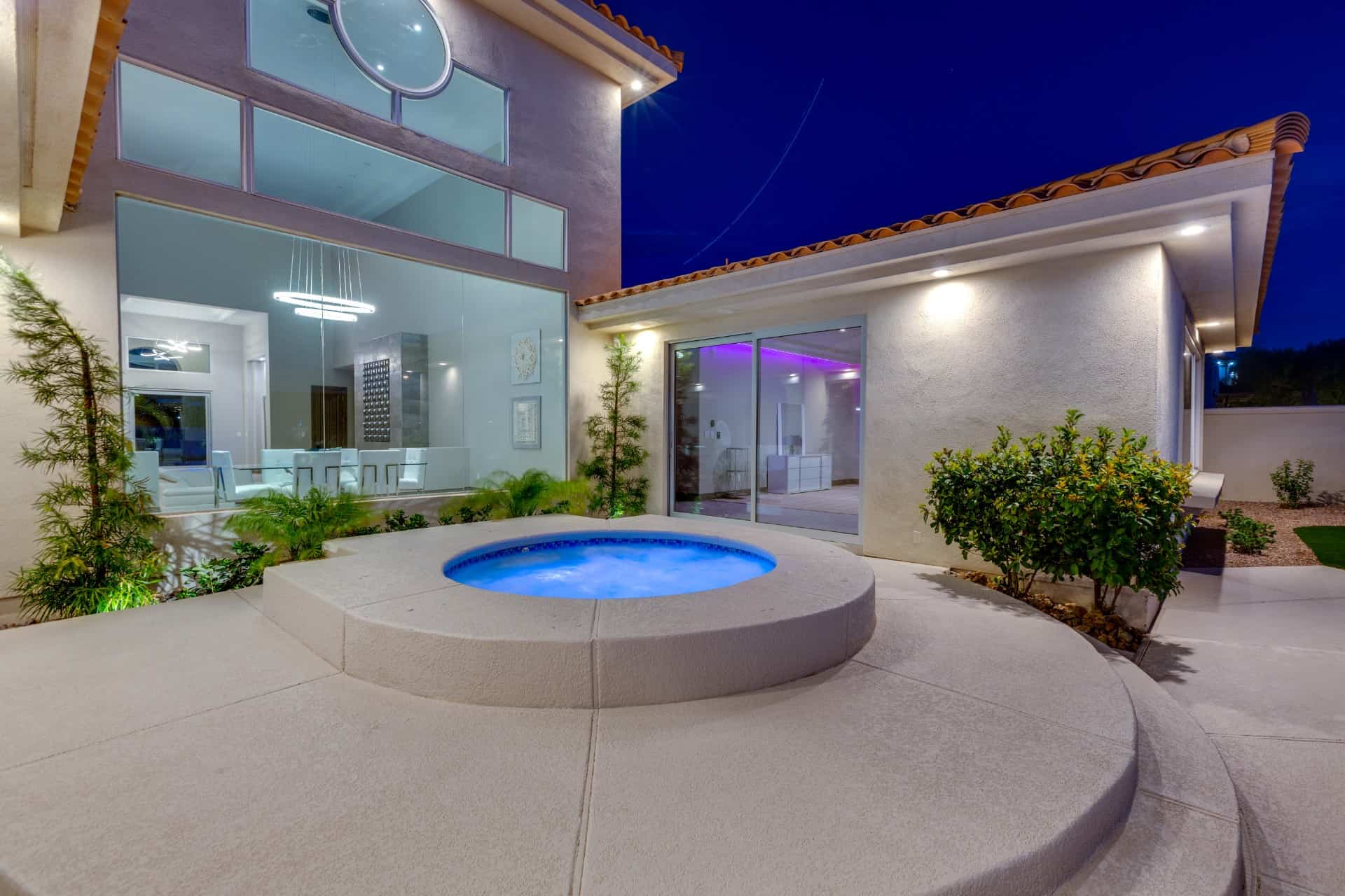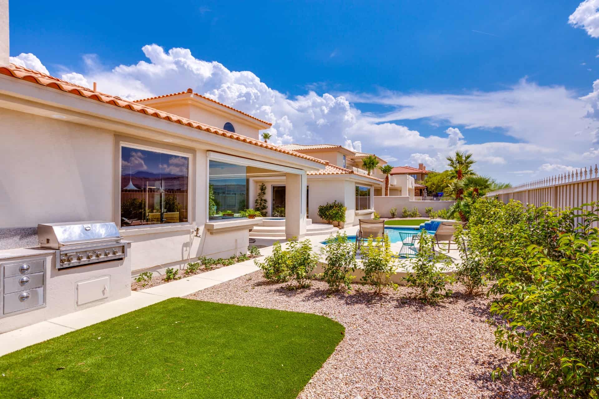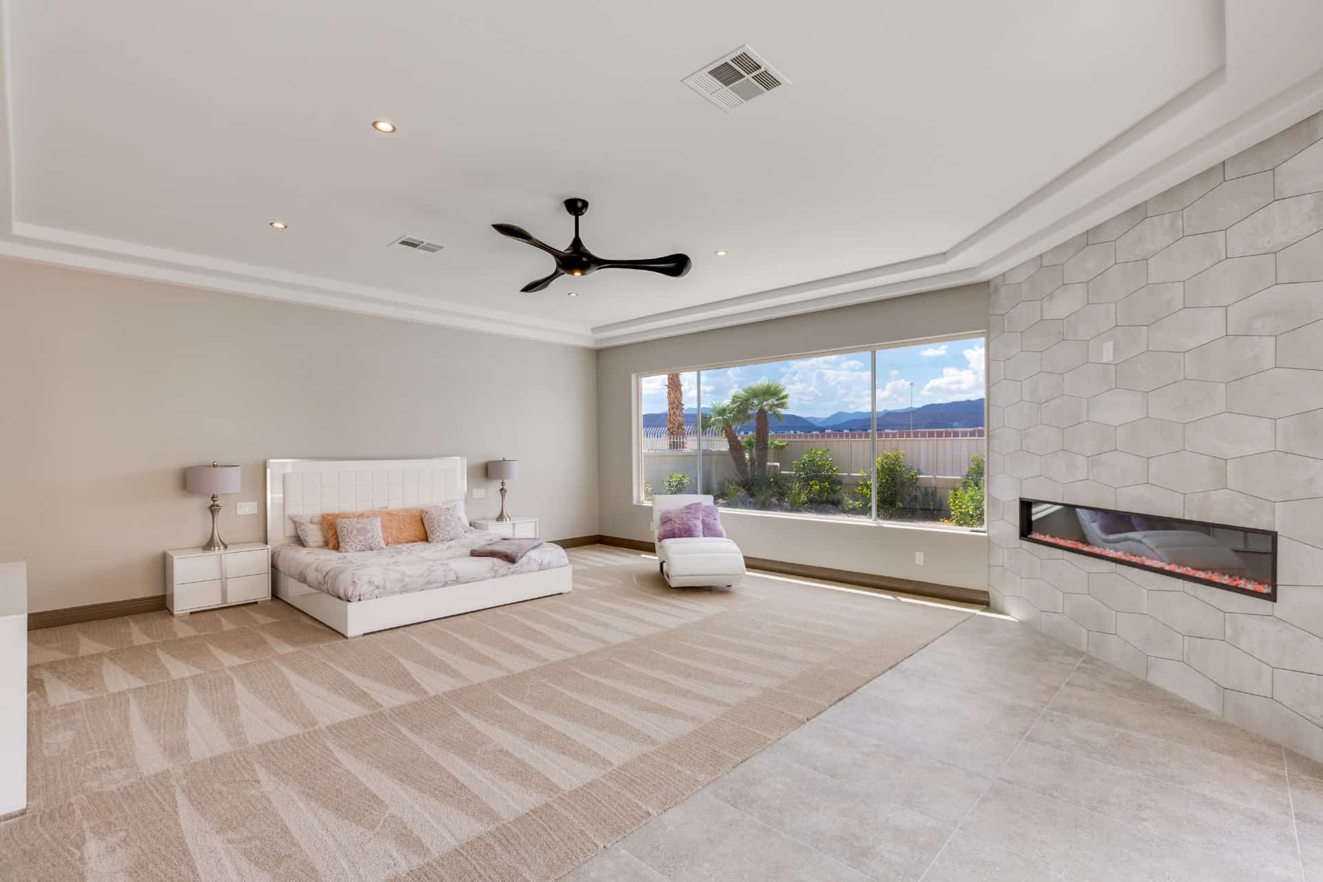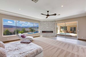 Welcome your guests through the 5’8” wide pivoting glass door, where they’ll be impressed by 23’ ceilings, a monumental LED fireplace, and mountain views framed by picture windows. Designed for the modern chef and entertainer at heart, the kitchen boasts waterfall edge quartz counters, $20,000 worth of stainless steel appliances, and two-tone custom cabinetry with soft-close drawers, stay-lift hinges, and under-cabinet lighting. Whether you’re sharing casual cuisine at the five-seat breakfast bar or formal fare in the dining room, you’ll never lack dining options. Choose a bottle of wine from the great room’s wet bar, then pour yourself a glass (or two) on the covered patio, complete with solar shades that retract at the press of a button. In the rear yard, take a dip in the recently-resurfaced Pebble Tec pool and spa, lounge on the sun deck, or barbecue at the built-in grill.