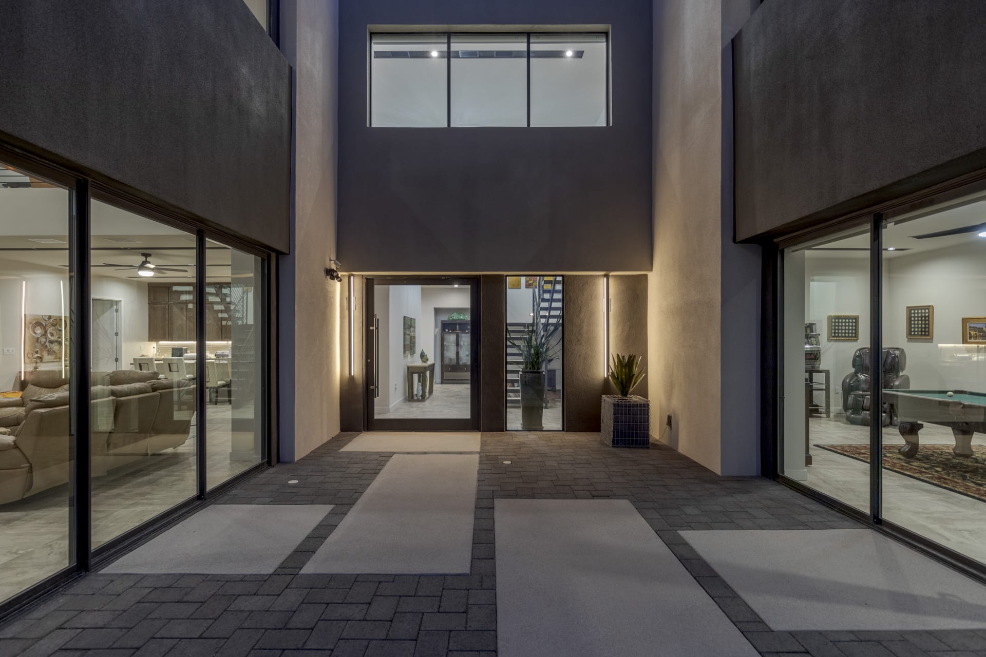 Wake up to stunning sunrise views in the main-level owner’s suite, which boasts pool access, a linear fireplace, a double shower with body jets, and a custom closet by Classy Closets. Five additional en suite bedrooms with custom walk-in closets complete this home, including a spacious junior suite. Additional highlights include five AC units with eight zones, motorized solar shades, pre-wiring for solar power with a junction box on the roof, five exterior cameras—plus a a four-car garage with an EV charging outlet, custom smoked glass garage doors, and showroom-quality flooring that is gas, acid, and anti-freeze-resistant.