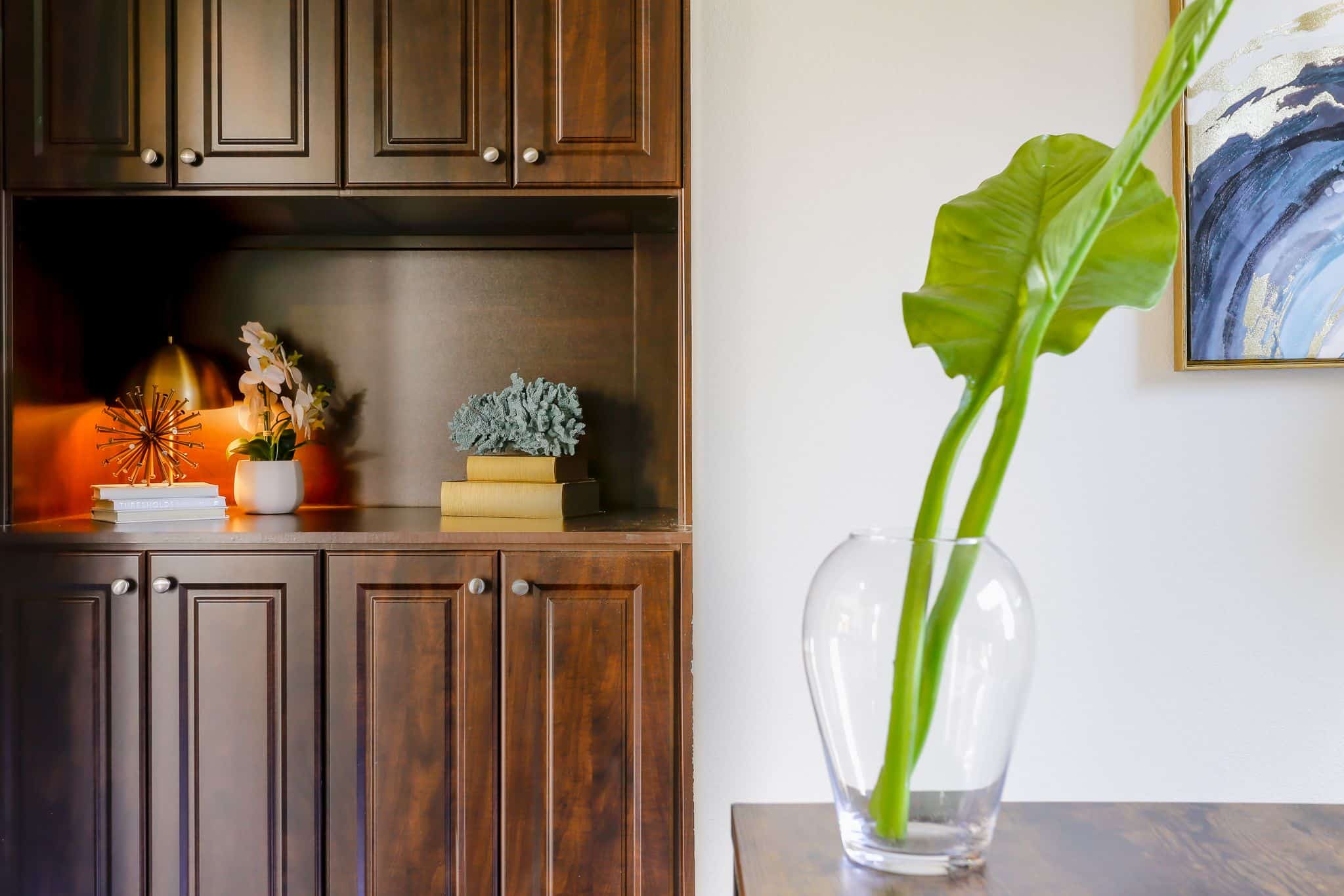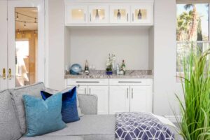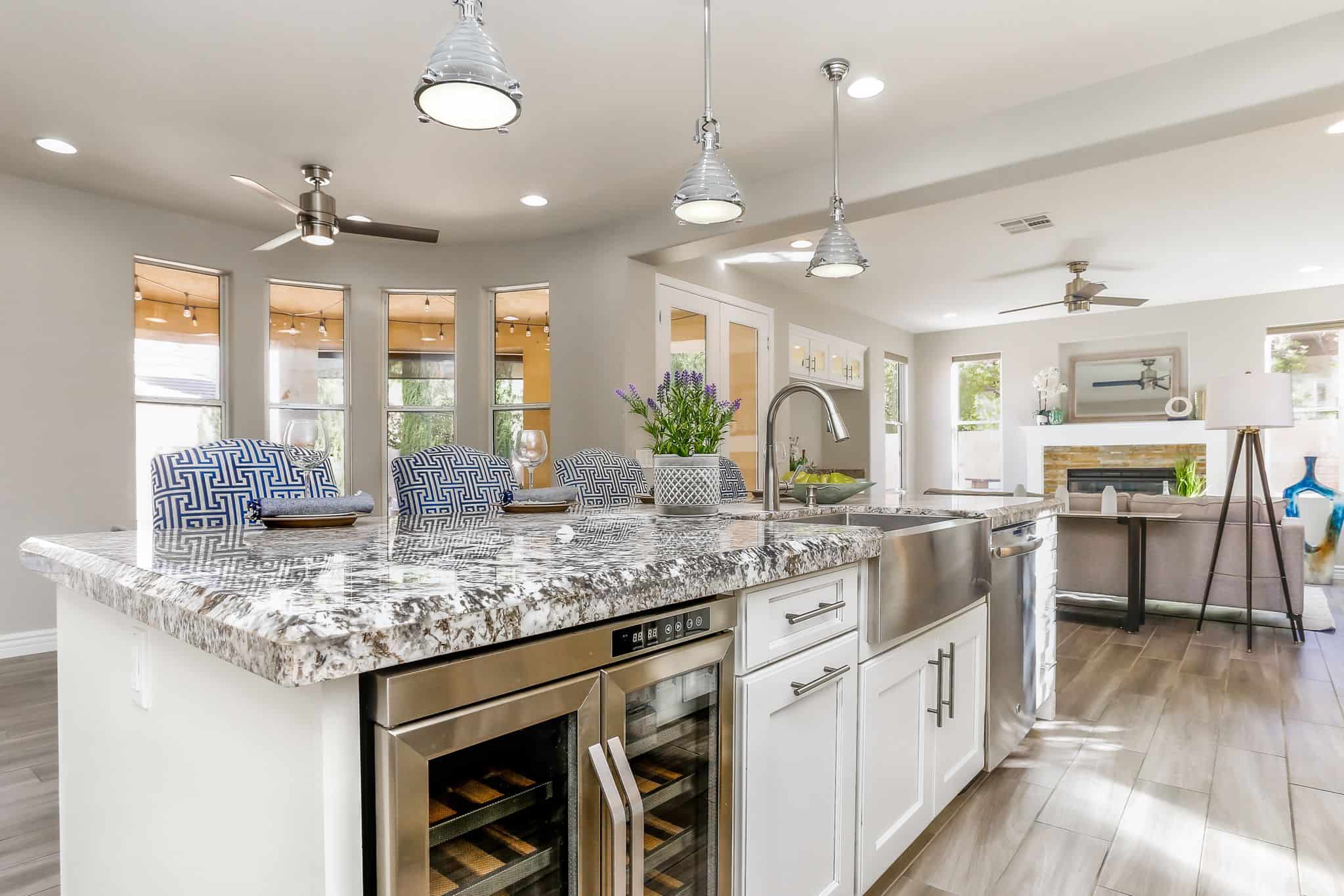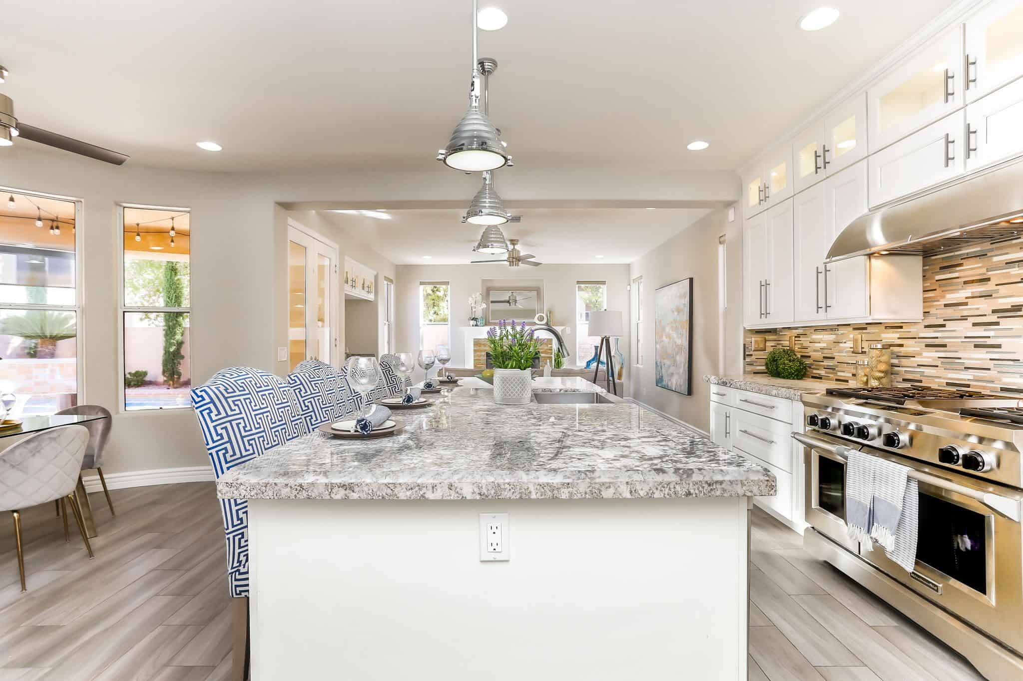 Welcome your guests beneath 19’ ceilings in the living room, which connects seamlessly to the formal dining room. The centerpiece of the expanded eat-in kitchen is a 10’ long island with seating for five, under-counter power outlets, a farmhouse sink, and an integrated wine cooler. Here, custom soft-close cabinetry with upgraded inserts envelops a curated collection of stainless steel appliances, including a commercial-style KitchenAid range with six burners, a griddle, and a double steam assist oven. In the great room, catch a movie on the built-in entertainment center while flames flicker in one of the home’s three gas fireplaces. Ideal for entertaining, two pairs of French doors open to the covered patio with a retractable shade. Outside, you can lounge in the L-shaped pool or fire up the built-in Kenmore Elite grill for a barbecue.