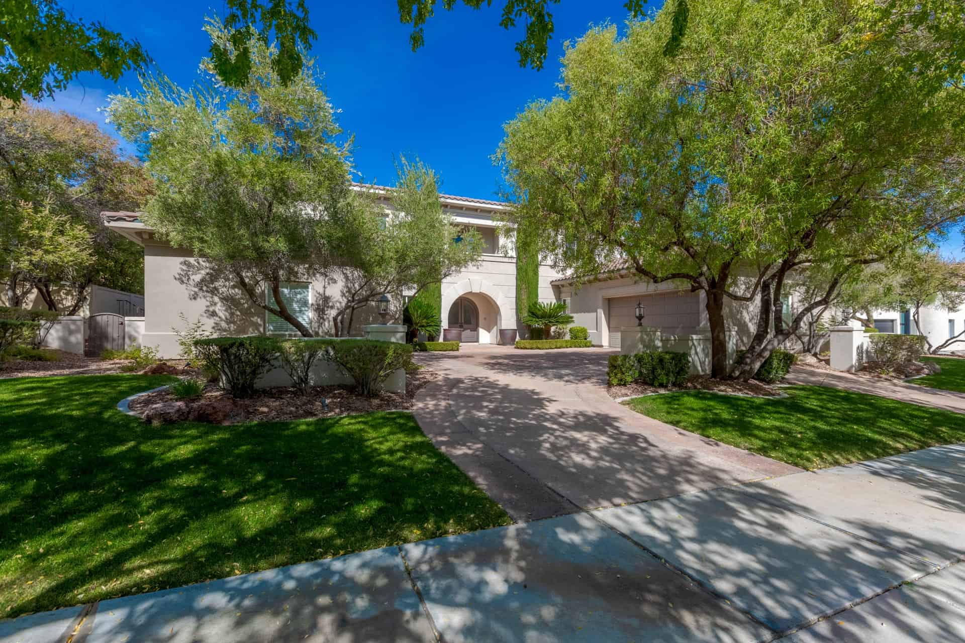 Beyond the horseshoe driveway and Italian cypress trees that mark the entry, welcome your guests into the open plan living room and dining room, where two pairs of French doors open to the patio. Hardwood plank floors provide a solid foundation for most of the main level, including the kitchen. Here, granite countertops and custom cabinetry with under-cabinet lights envelop a suite of stainless steel Thermador Professional appliances. Boasting cathedral ceilings, a monumental stone fireplace, and a dining area, the attached great room is perfect for entertaining friends and family alike. Grab a drink from the nearby wet bar and step outside to enjoy the shade on the travertine patio, go for a swim in the pool, or play badminton on the expansive lawn. When duty calls, conquer your day in the main level office, then rest and rejuvenate in the owner’s suite, complete with rear yard access, wool carpet, and motorized Hunter Douglas shades. The luxurious bathroom includes every amenity you might desire: a custom closet system by Absolute Closets, floor-to-ceiling natural polished travertine, a basin tub, and a walk-in shower with a bench and body wand. A guest bedroom with adjacent bathroom completes the main level, while two en suite bedrooms and a loft complete the upper level Additional highlights of this home include wiring for whole home sound, water filtration, Minka-Aire fans, central vacuum, ADT security, and 9 infrared exterior cameras.