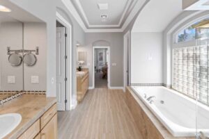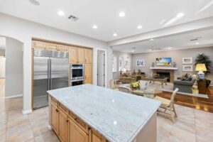 Soaring ceilings welcome you into the foyer and skylit dining room. Whether you’re entertaining in the living room or screening a surround sound movie in the family room, the unique floor plan of this home ensures that the eat-in kitchen is always nearby. Highlights of the kitchen include granite countertops, a large walk-in pantry, and a collection of high-end appliances—including a Sub-Zero refrigerator/freezer and LG double ovens.