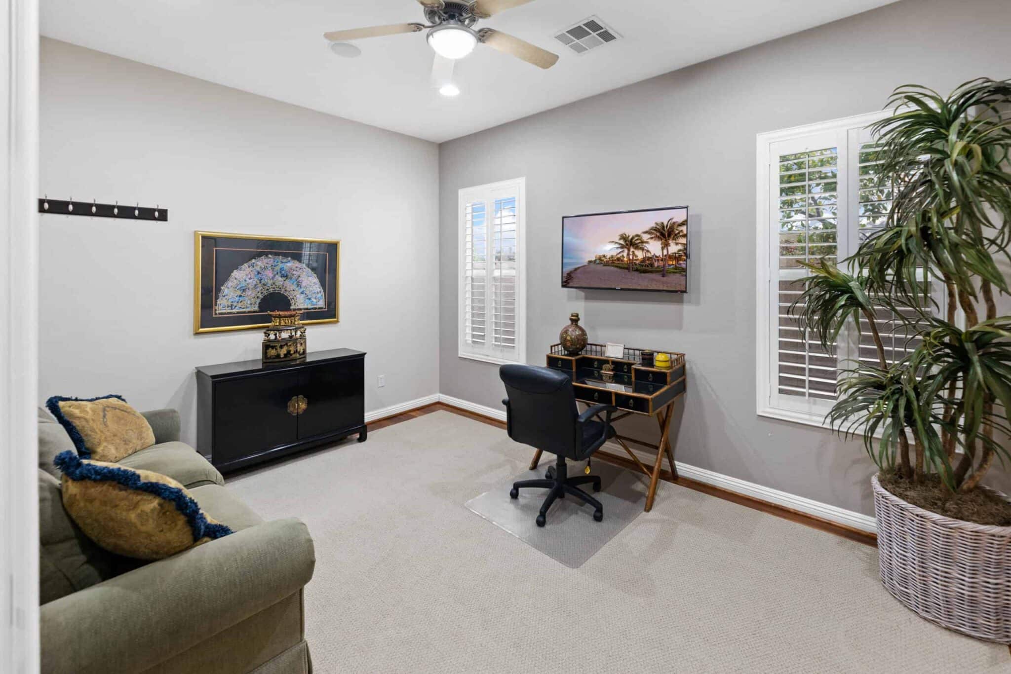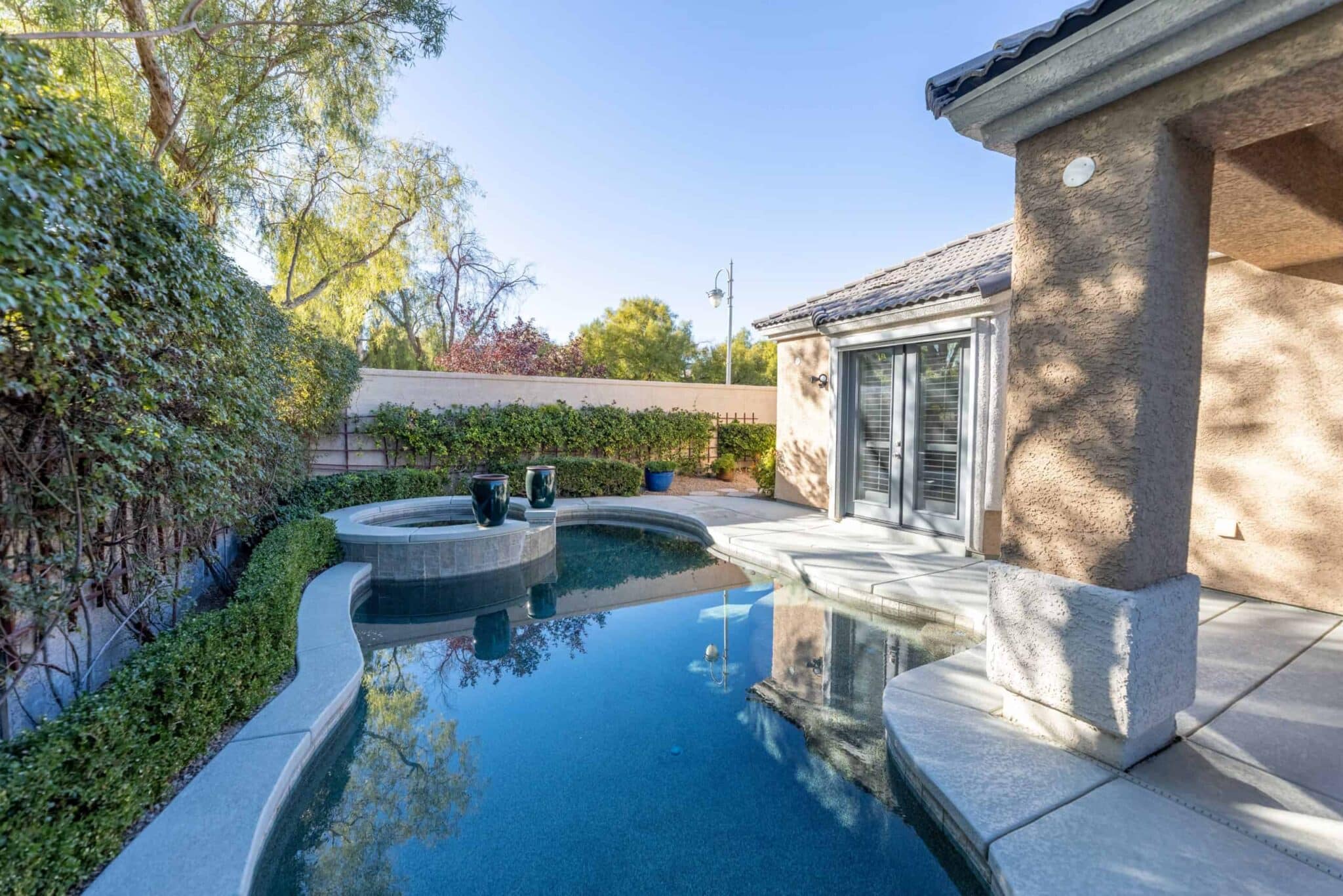Ultimate relaxation awaits in the owner’s suite, complete with a fireplace, dual vanities, a walk-in closet with built-ins, and a generous shower and jetted bathtub. From the bedroom, a pair of French doors gives you easy access to the pool, spa, and covered patio. A spacious den (ideal for a home office or gym) and two additional bedrooms complete this home.