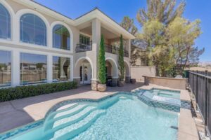 This two-story home in the guard-gated community of Queensridge features a recently refinished pool and spa, brand-new AC units, and much more. Wrapped around a central courtyard, with multiple balconies and patios, this home was designed for indoor/outdoor living. Step inside and discover a spacious, traditional floor plan with tile and natural stone finishes and wood built-ins.