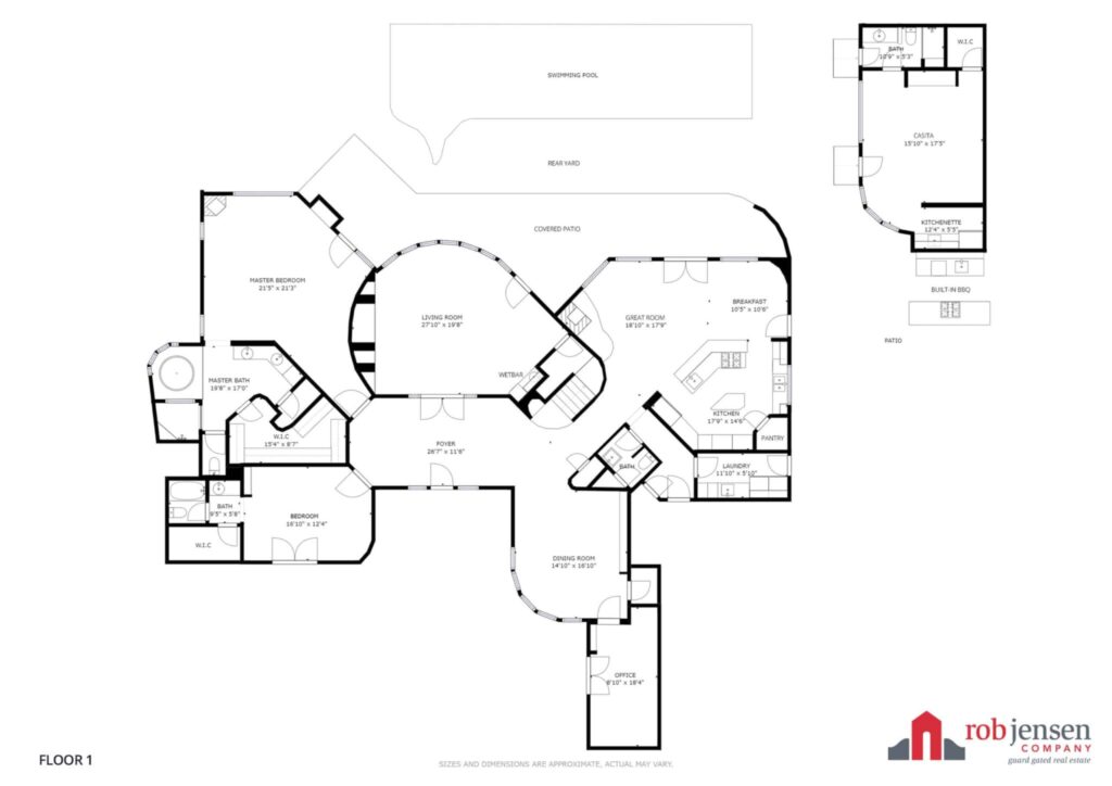 When relaxation beckons, the main level master suite awaits with a slew of amenities, including an oversized jacuzzi tub, a shower with a bench and body wand, as well as hers and his vanities and toilets. Completing the main house are three additional en suite bedrooms—one of which enjoys private access on the main level—and a game room loft with a wet bar. Located beside the pool, the casita includes a kitchenette, bathroom, and walk-in closet, making it ideal for use as a pool house, guest house, or in-law suite.