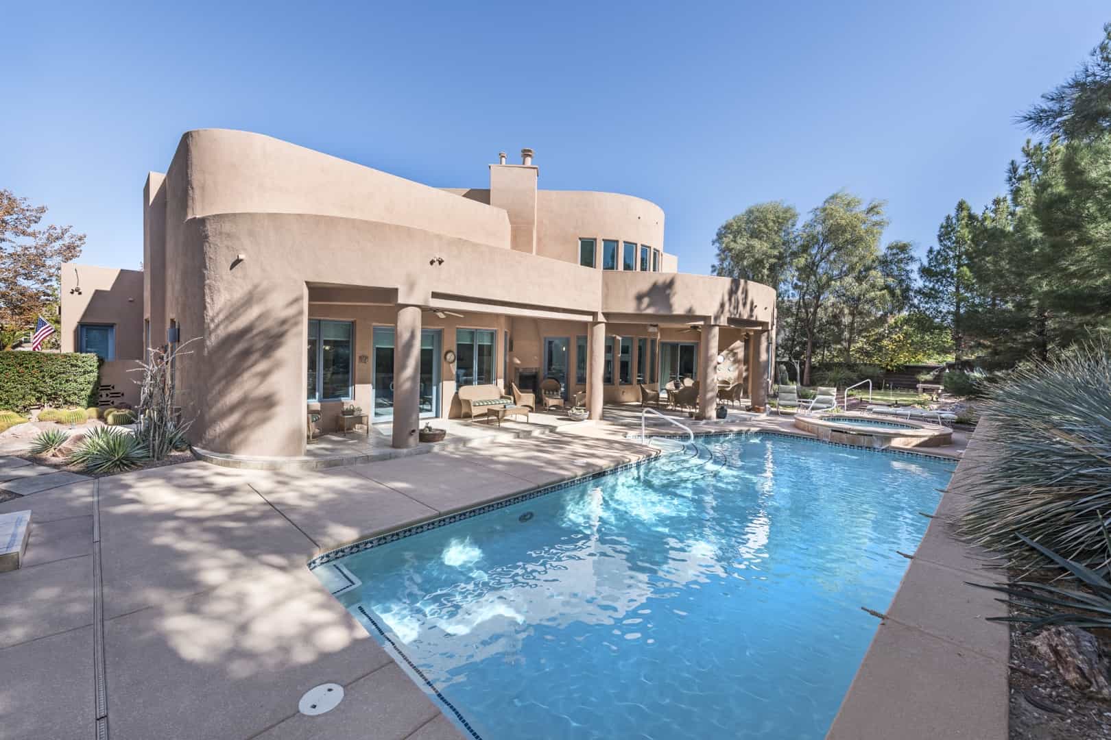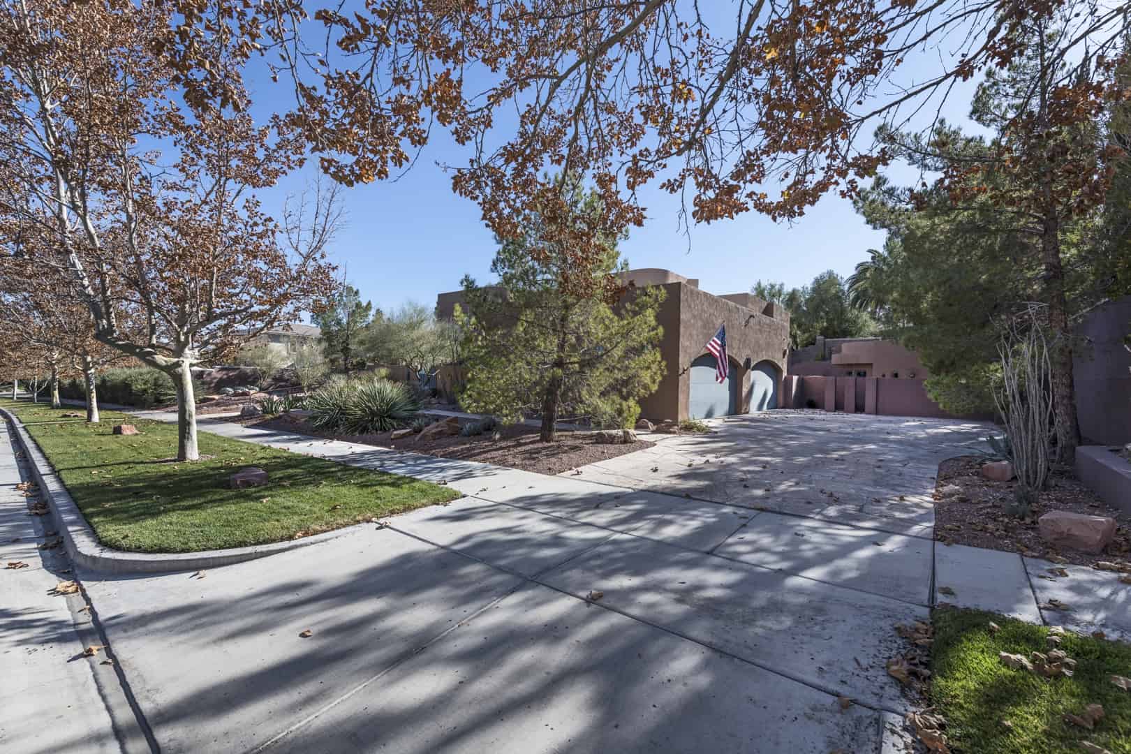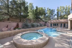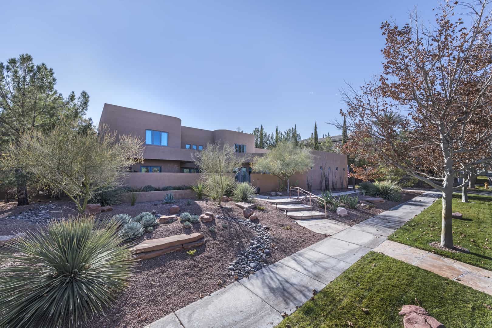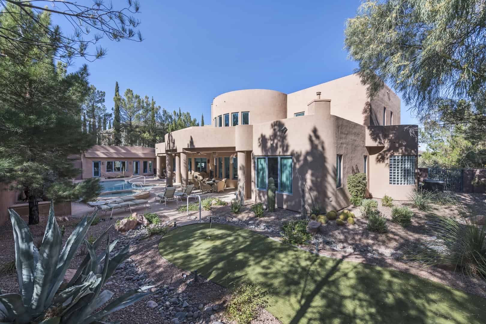 This custom two-story estate with casita boasts adobe-inspired architecture and a tranquil setting within Mountain Trails—a 24-hour guard gated community in The Trails Village of Summerlin. Situated on a half-acre lot, this home has a floor plan designed to become one with its surroundings.