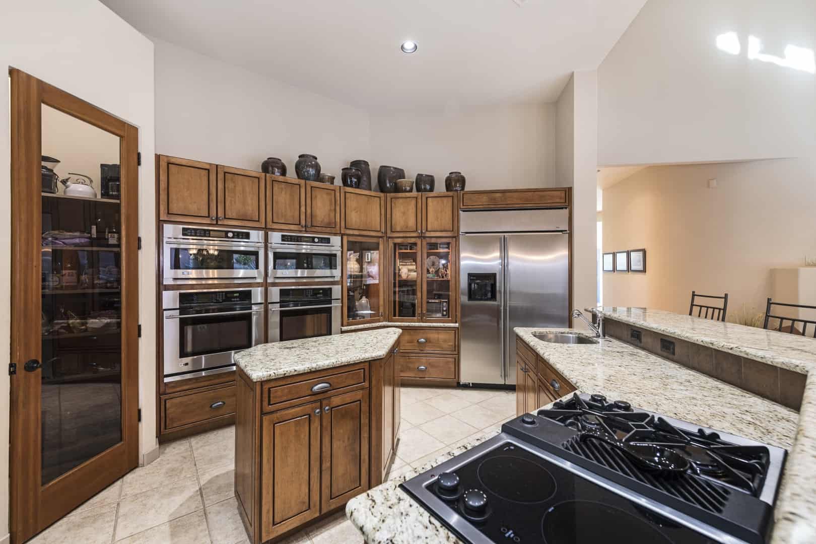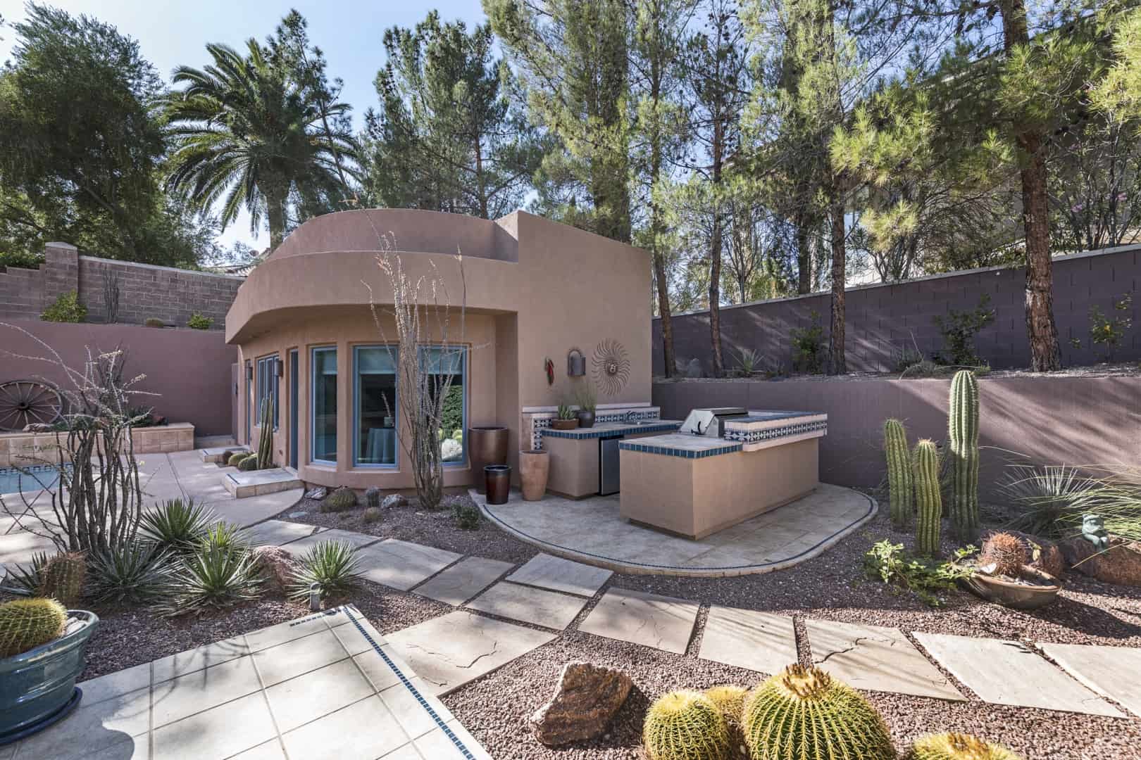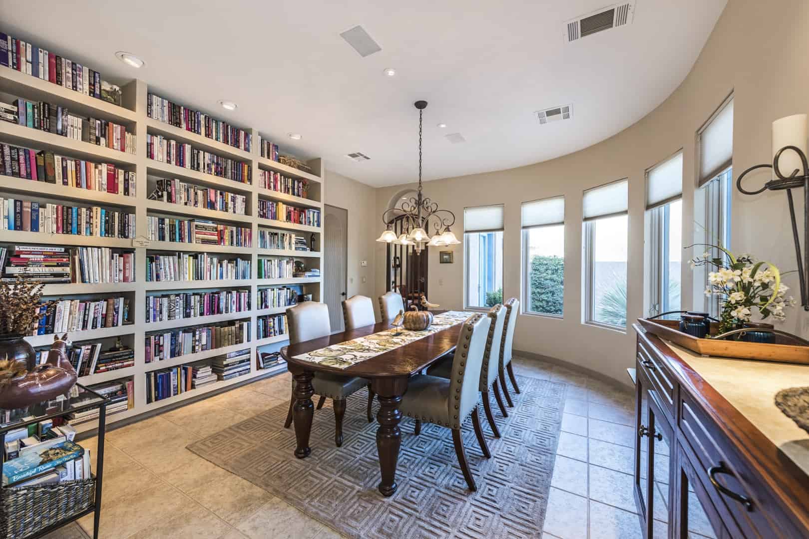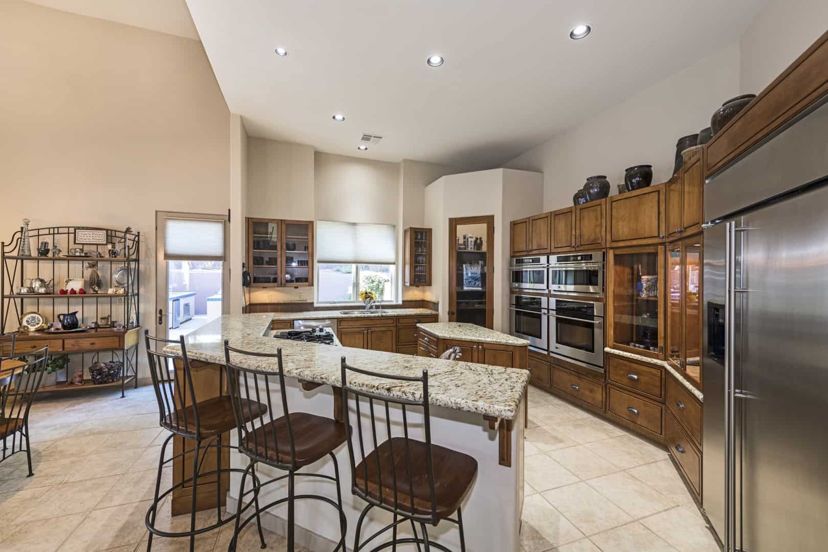 Multiple doors open to both the serene desert garden out front and the generous patio overlooking the pool, spa, and putting green out back. Upon stepping into this home, you’ll enjoy the silence provided by double-stud exterior walls and superior insulation. Welcome your guests into the living room and offer them a drink at the wet bar. Here, with your favorite tunes playing on the built-in surround sound, enjoy the sense of openness evoked by 212’ ceilings and a wall of picture windows. Dinner is served in the kitchen, where granite counters and custom cabinetry envelop a suite of stainless steel GE Monogram appliances—including double ovens and double microwaves. Utterly convenient, the outdoor kitchen is just steps away through a side door. Dine al fresco on the patio or enjoy a formal meal in the library dining room. The office enjoys access to the gated front yard, making it easy to step outside for a breath of fresh air.