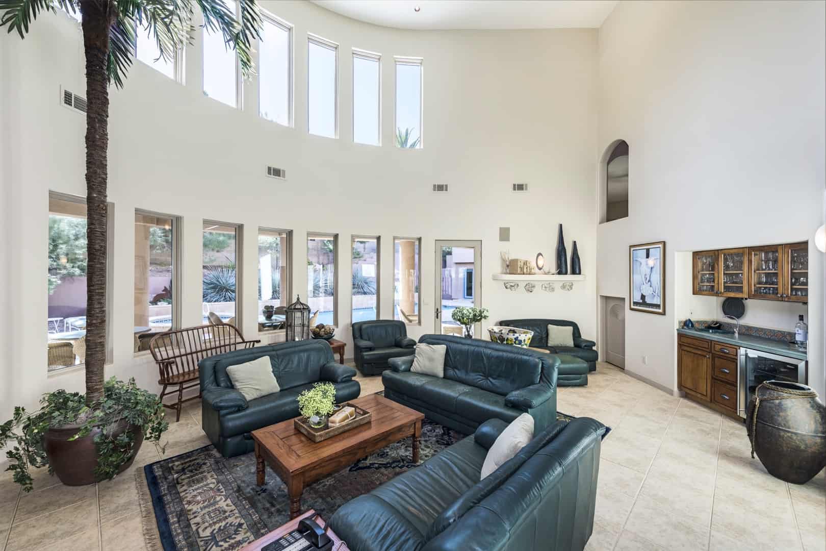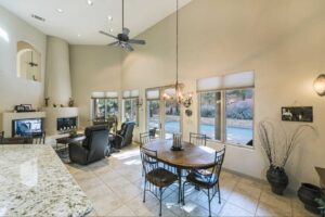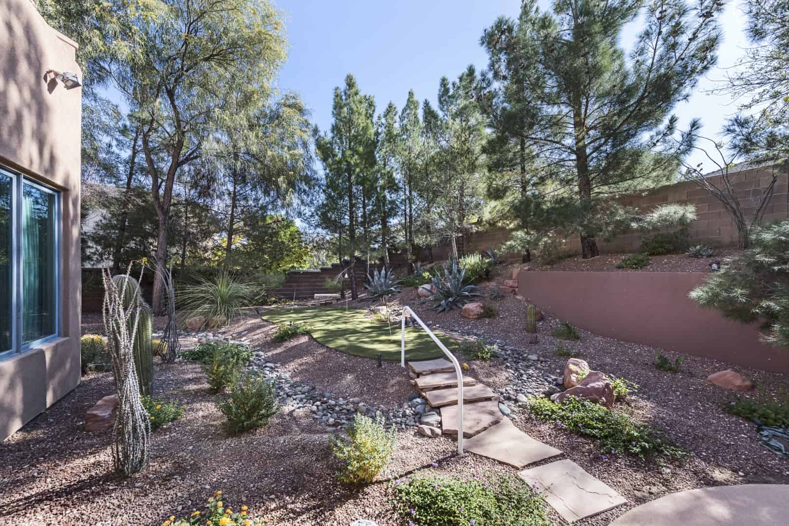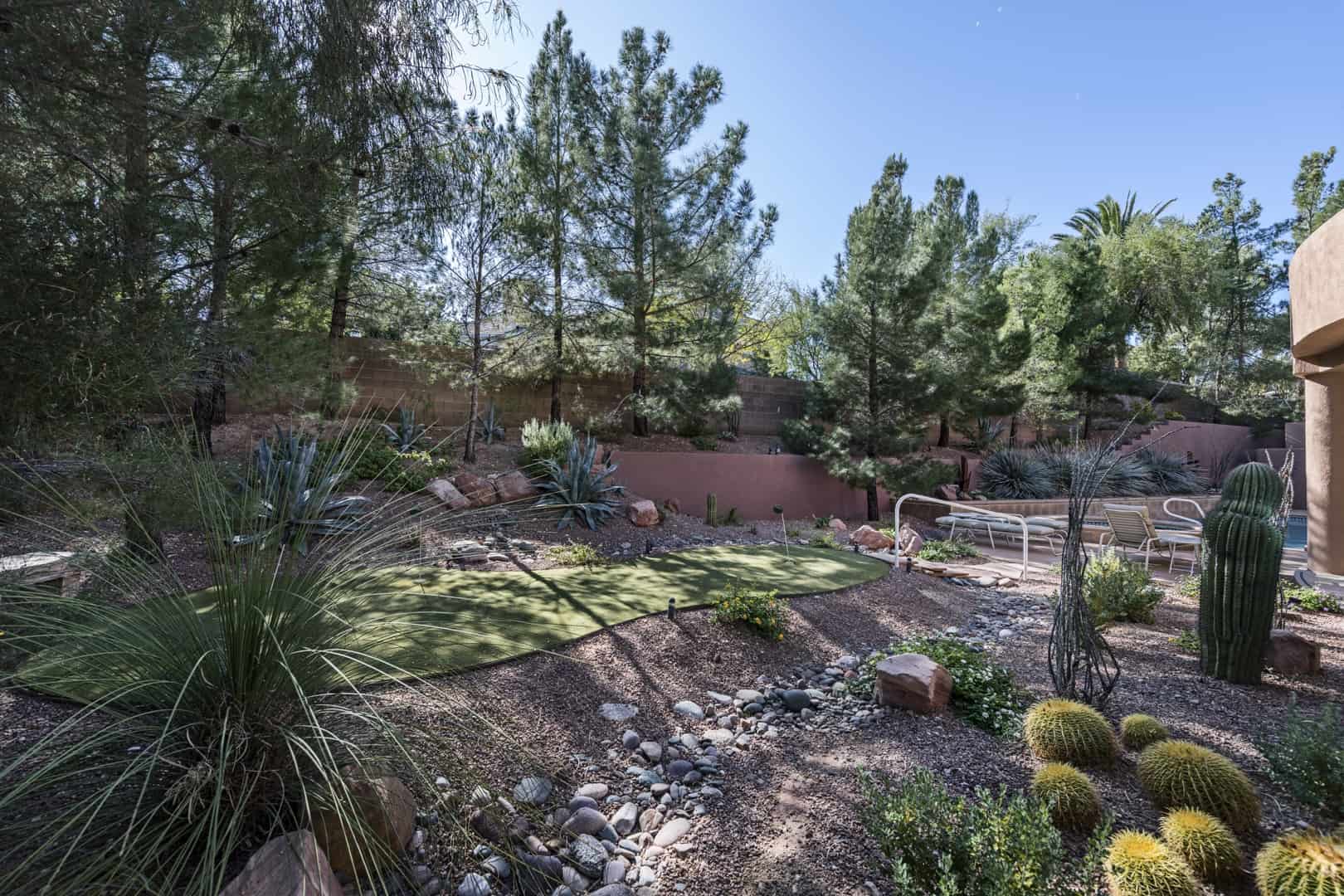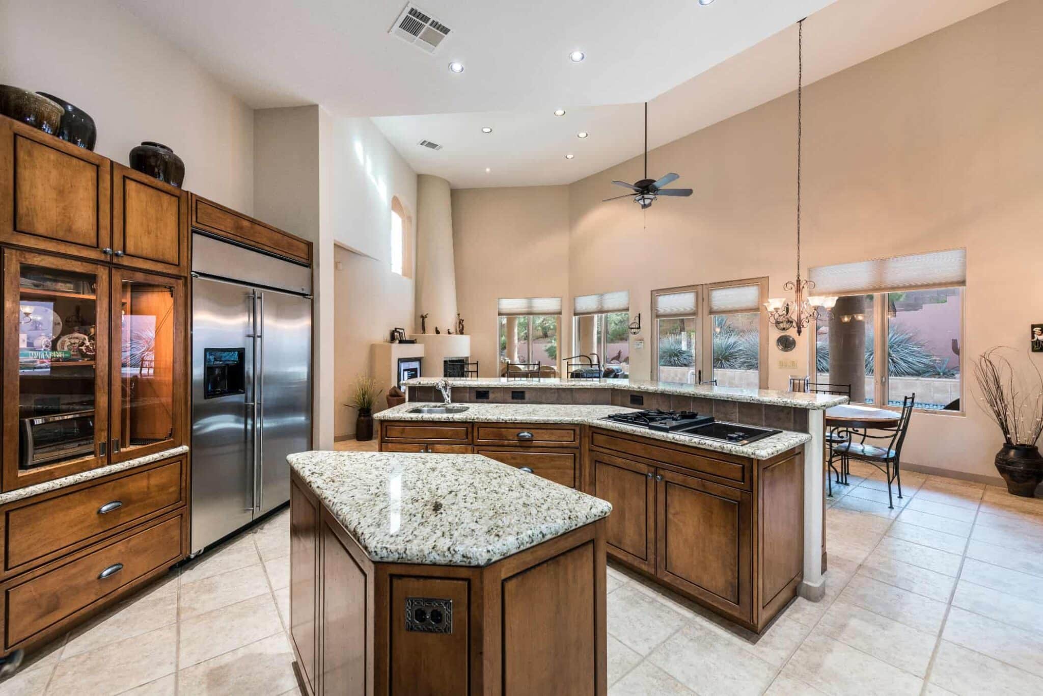 Multiple doors open to both the serene desert garden out front and the generous patio overlooking the pool, spa, and putting green out back. Upon stepping into this home, you’ll enjoy the silence provided by double-stud exterior walls and superior insulation. Welcome your guests into the living room and offer them a drink at the wet bar. Here, with your favorite tunes playing on the built-in surround sound, enjoy the sense of openness evoked by 212’ ceilings and a wall of picture windows. Dinner is served in the kitchen, where granite counters and custom cabinetry envelop a suite of stainless steel GE Monogram appliances—including double ovens and double microwaves. Utterly convenient, the outdoor kitchen is just steps away through a side door. Dine al fresco on the patio or enjoy a formal meal in the library dining room. The office enjoys access to the gated front yard, making it easy to step outside for a breath of fresh air.