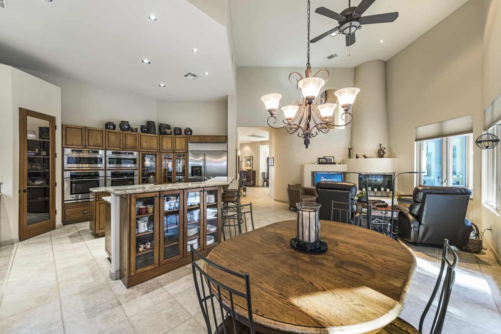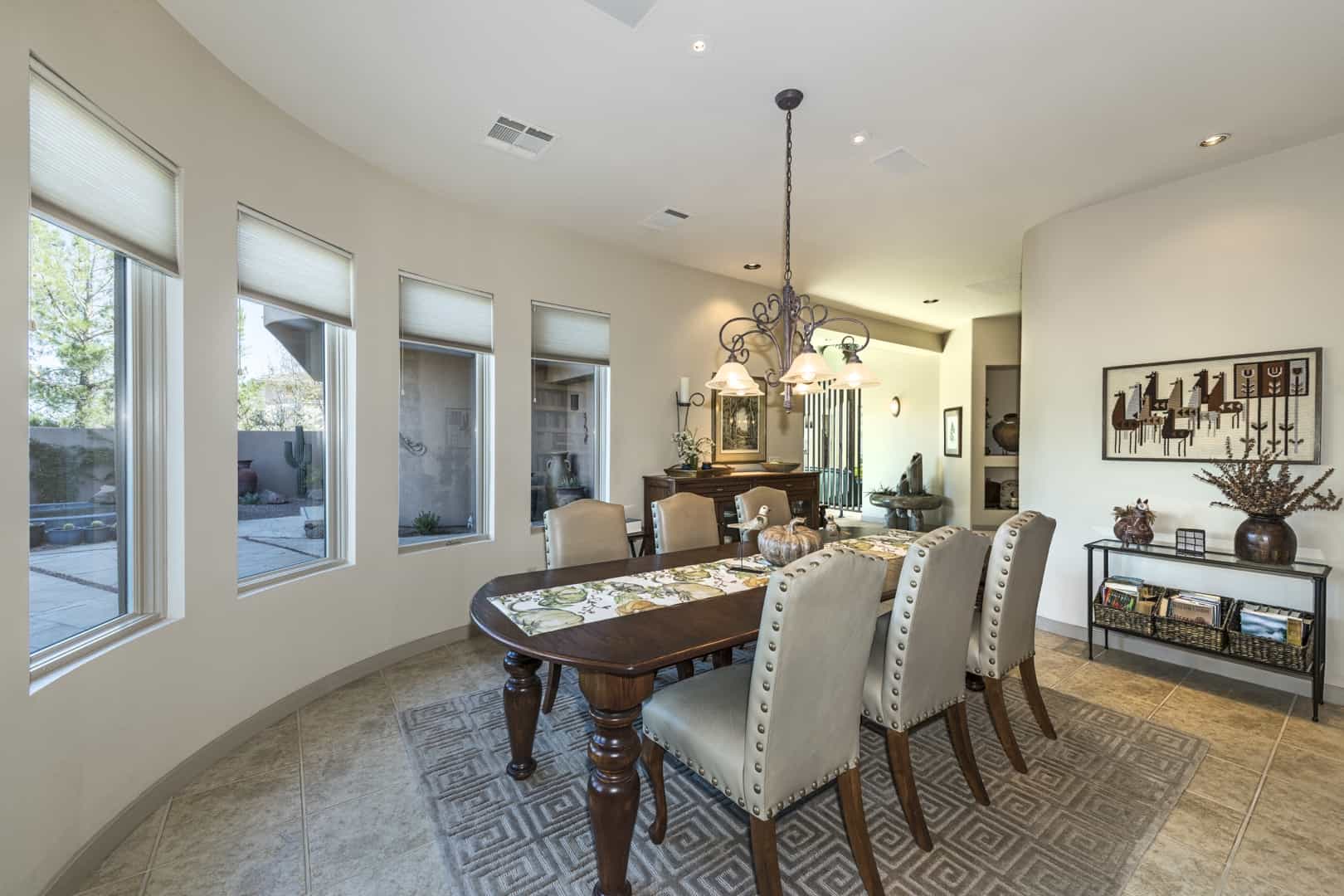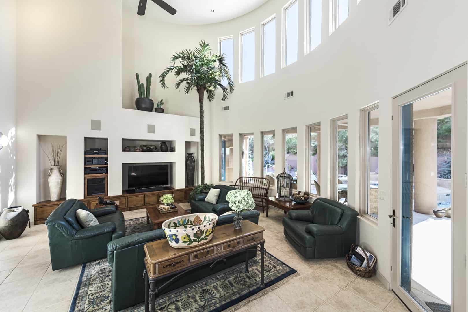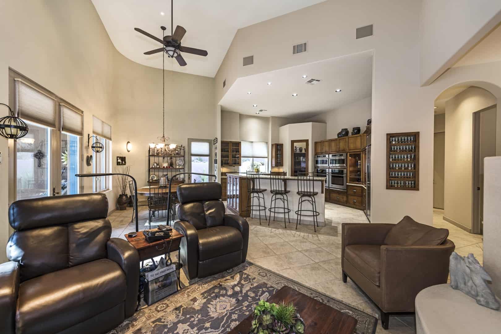 Multiple doors open to both the serene desert garden out front and the generous patio overlooking the pool, spa, and putting green out back. Upon stepping into this home, you’ll enjoy the silence provided by double-stud exterior walls and superior insulation. Welcome your guests into the living room and offer them a drink at the wet bar. Here, with your favorite tunes playing on the built-in surround sound, enjoy the sense of openness evoked by 212’ ceilings and a wall of picture windows. Dinner is served in the kitchen, where granite counters and custom cabinetry envelop a suite of stainless steel GE Monogram appliances—including double ovens and double microwaves. Utterly convenient, the outdoor kitchen is just steps away through a side door. Dine al fresco on the patio or enjoy a formal meal in the library dining room. The office enjoys access to the gated front yard, making it easy to step outside for a breath of fresh air.