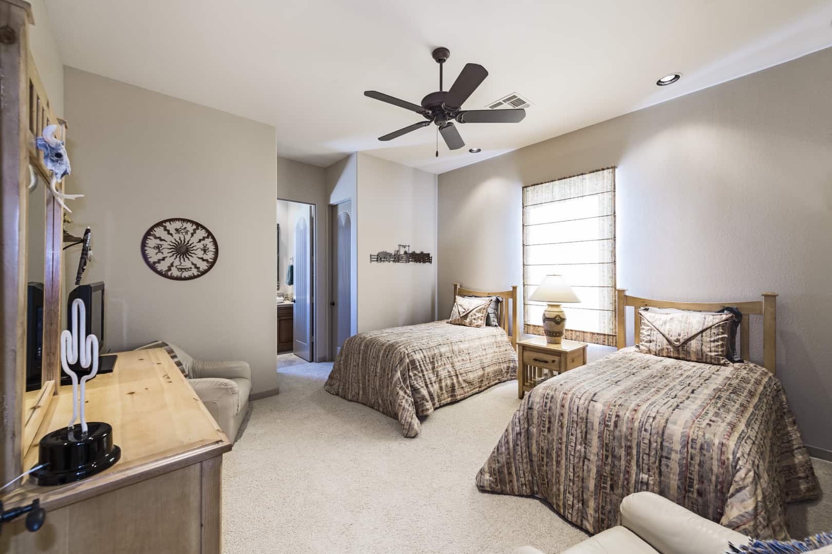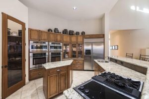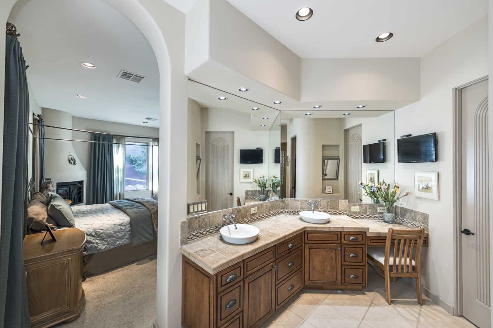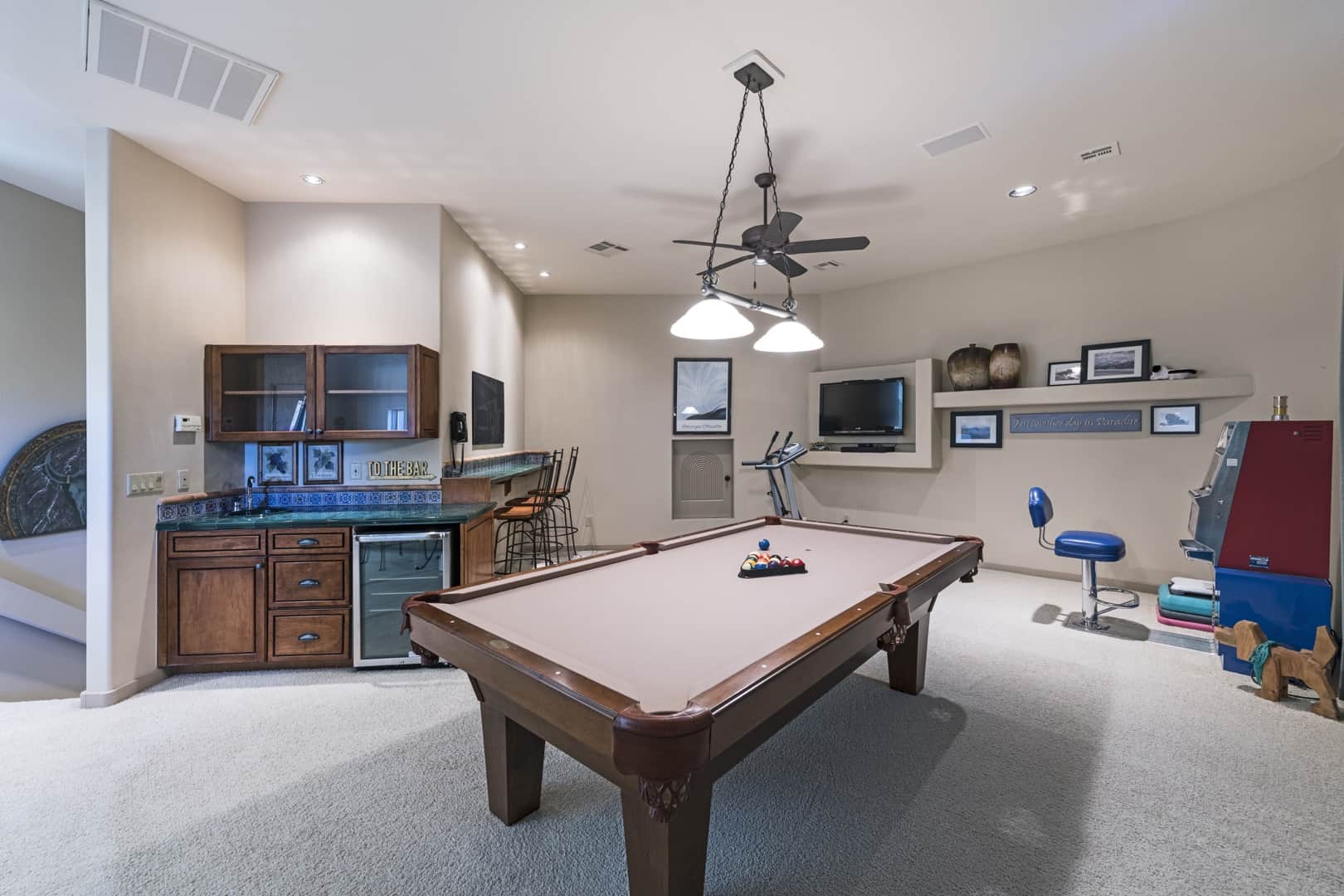 When relaxation beckons, the main level master suite awaits with a slew of amenities, including an oversized jacuzzi tub, a shower with a bench and body wand, as well as hers and his vanities and toilets. Completing the main house are three additional en suite bedrooms—one of which enjoys private access on the main level—and a game room loft with a wet bar. Located beside the pool, the casita includes a kitchenette, bathroom, and walk-in closet, making it ideal for use as a pool house, guest house, or in-law suite.