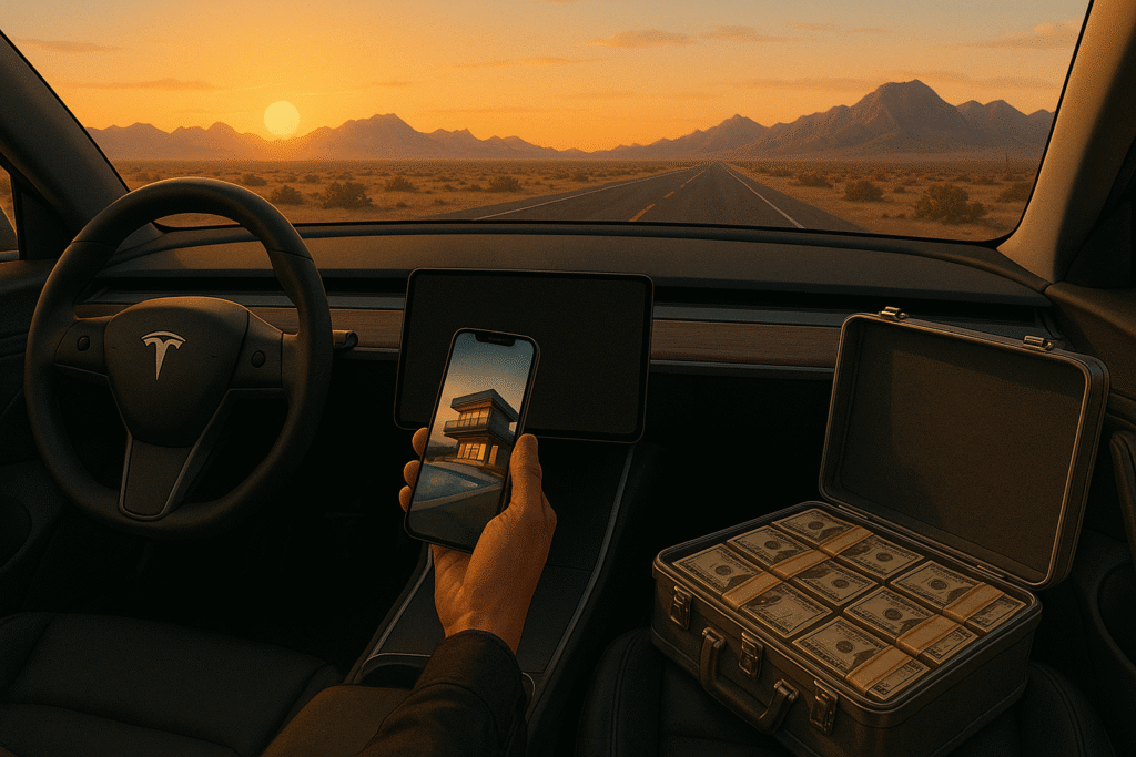 Just after sunrise in L.A., his Tesla slips onto the I-15, sun glinting off the hood, autopilot engaged, and Zillow glowing on his phone. His destination—Vegas.